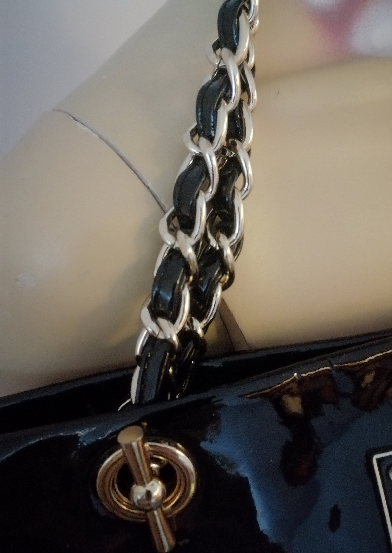 - Thick gold chain strap.