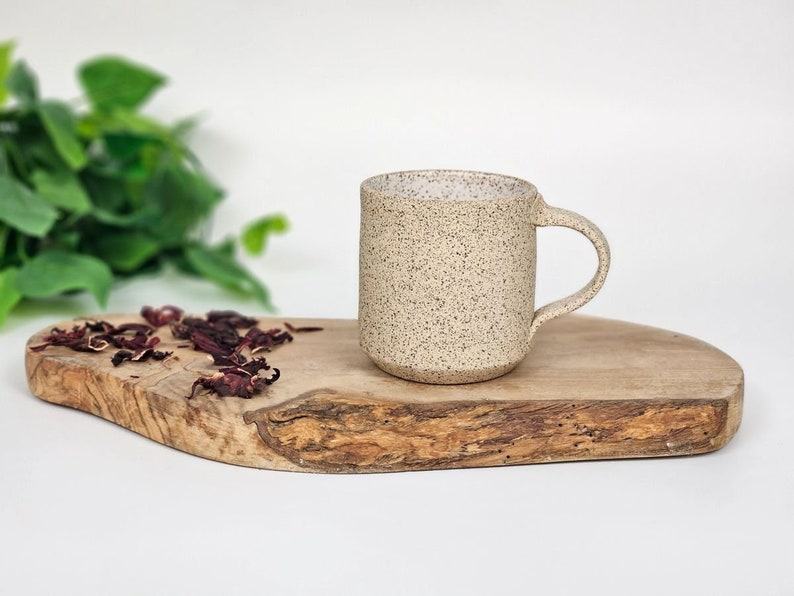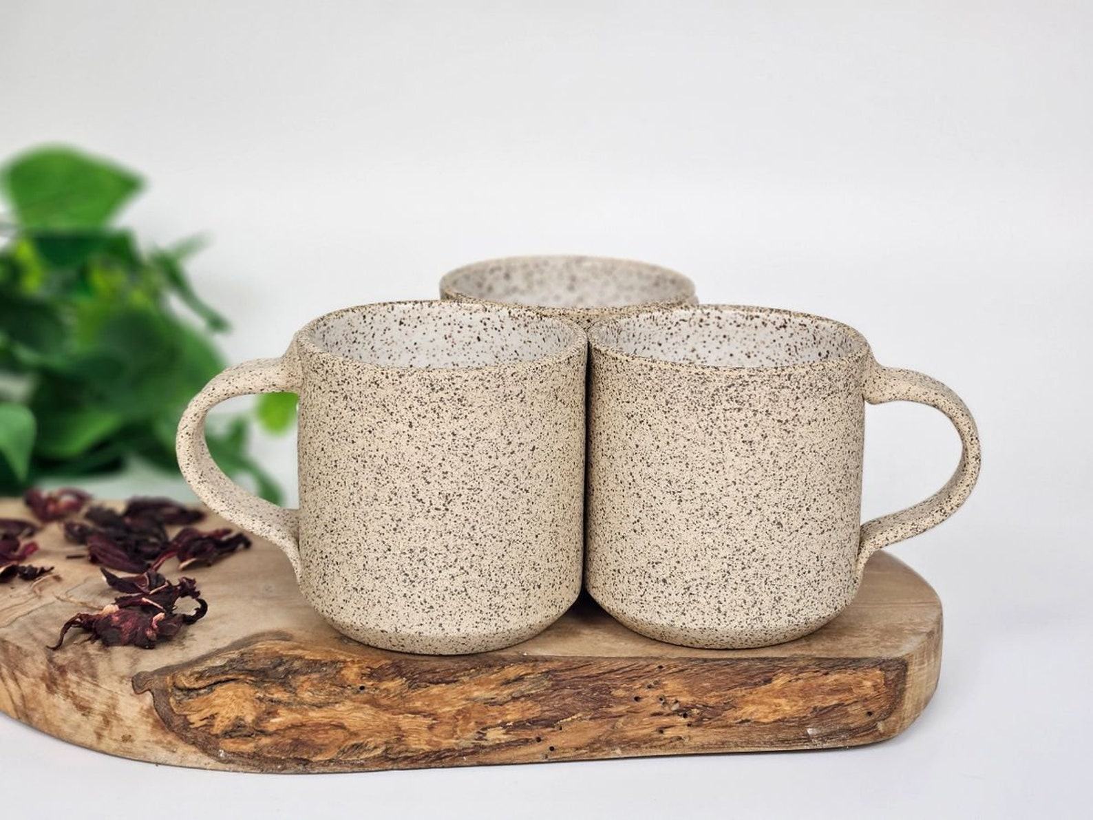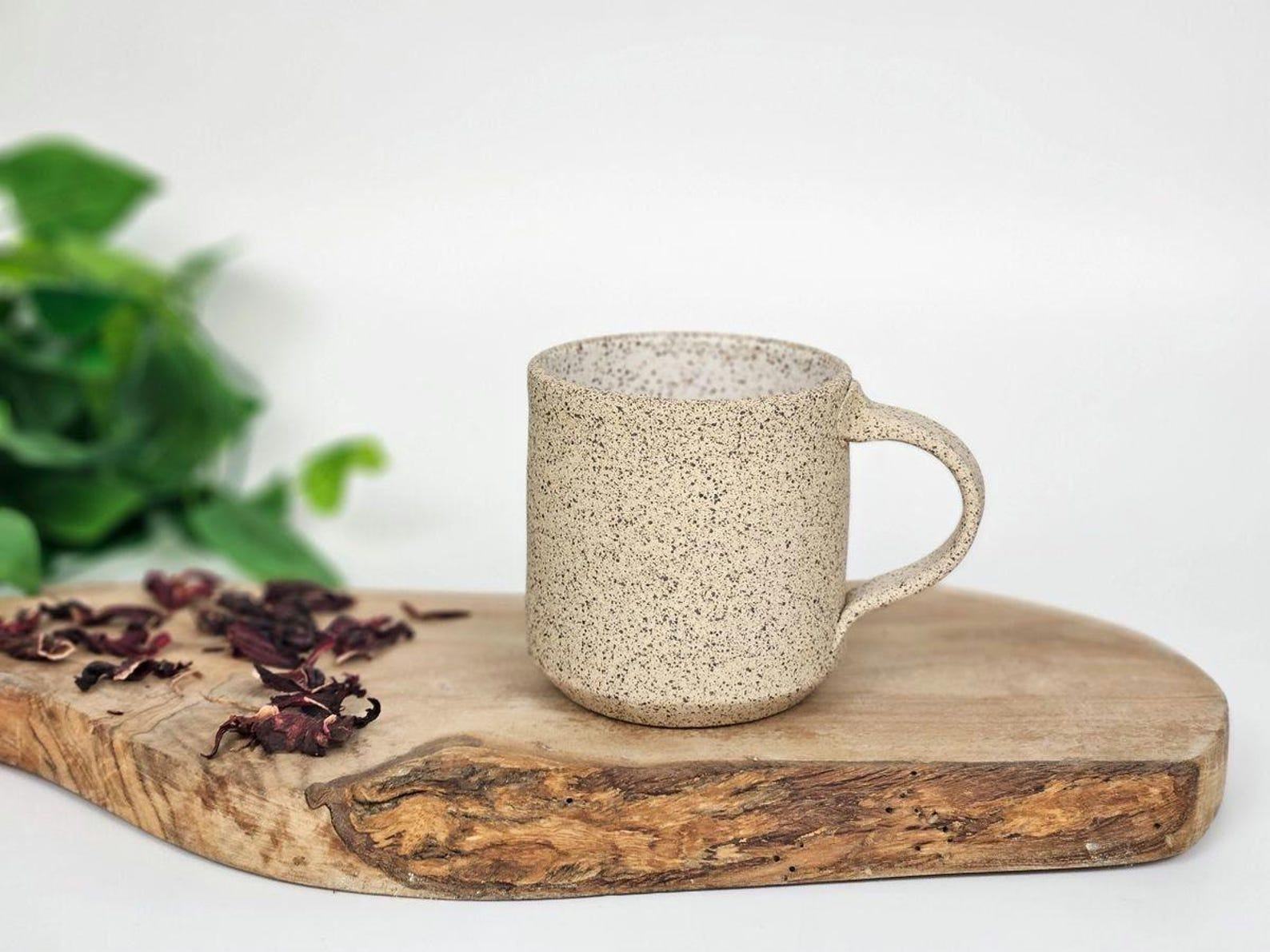 - Handmade stoneware coffee mug with a unique white and speckle design