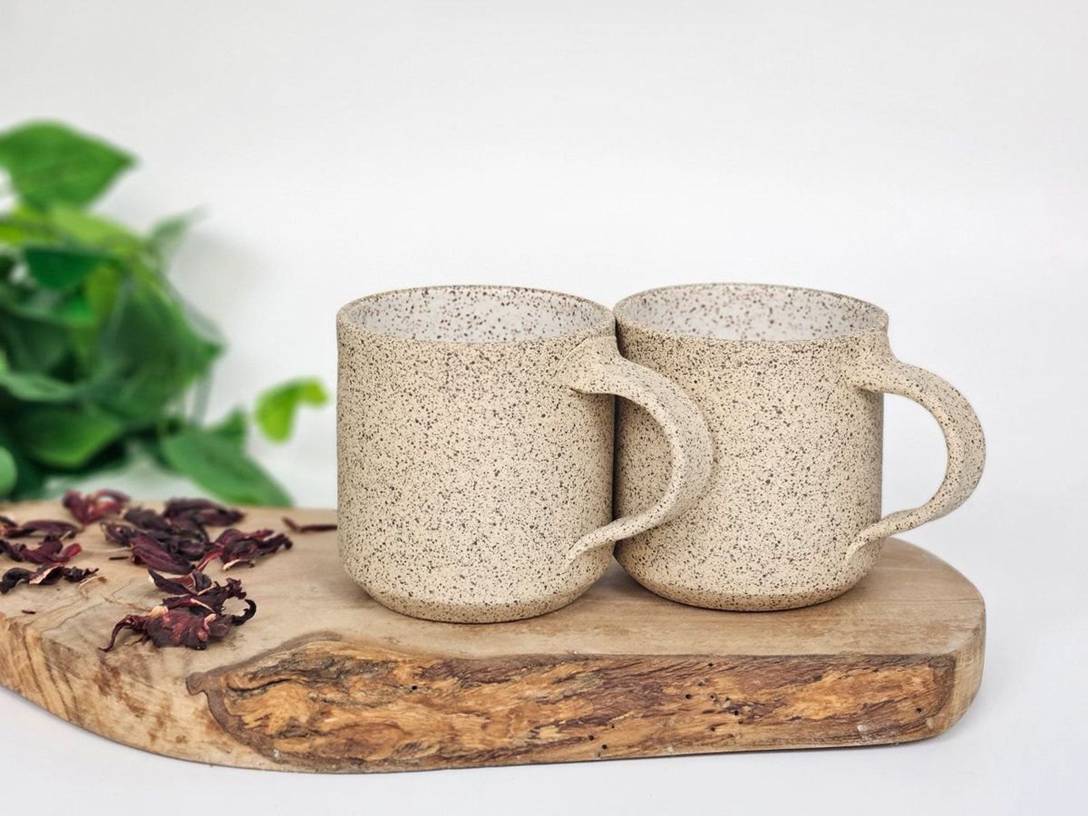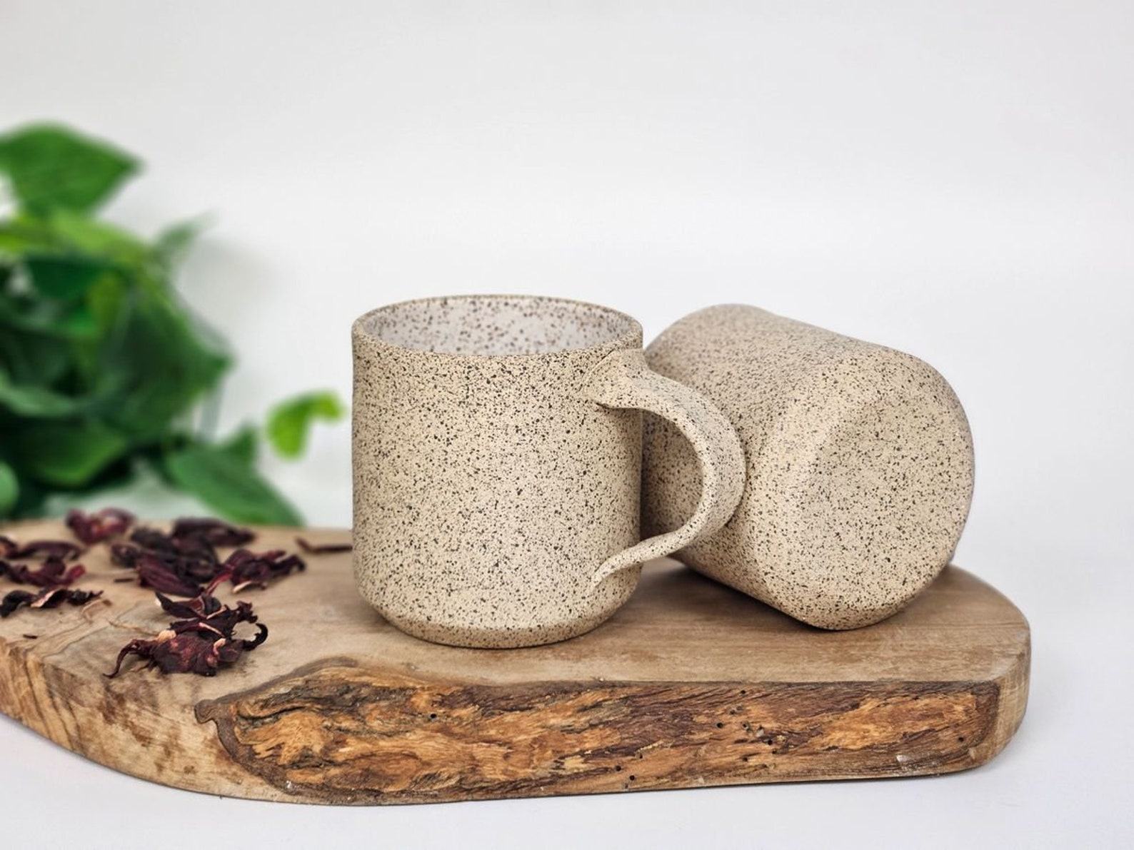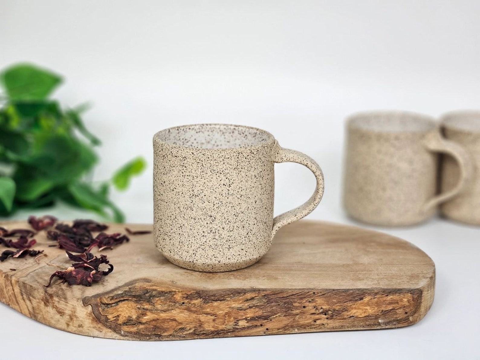 - Handmade stoneware coffee mug with a unique white and speckle design