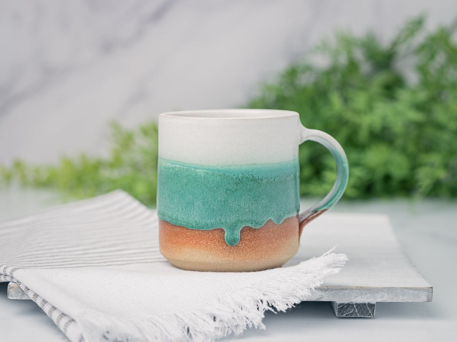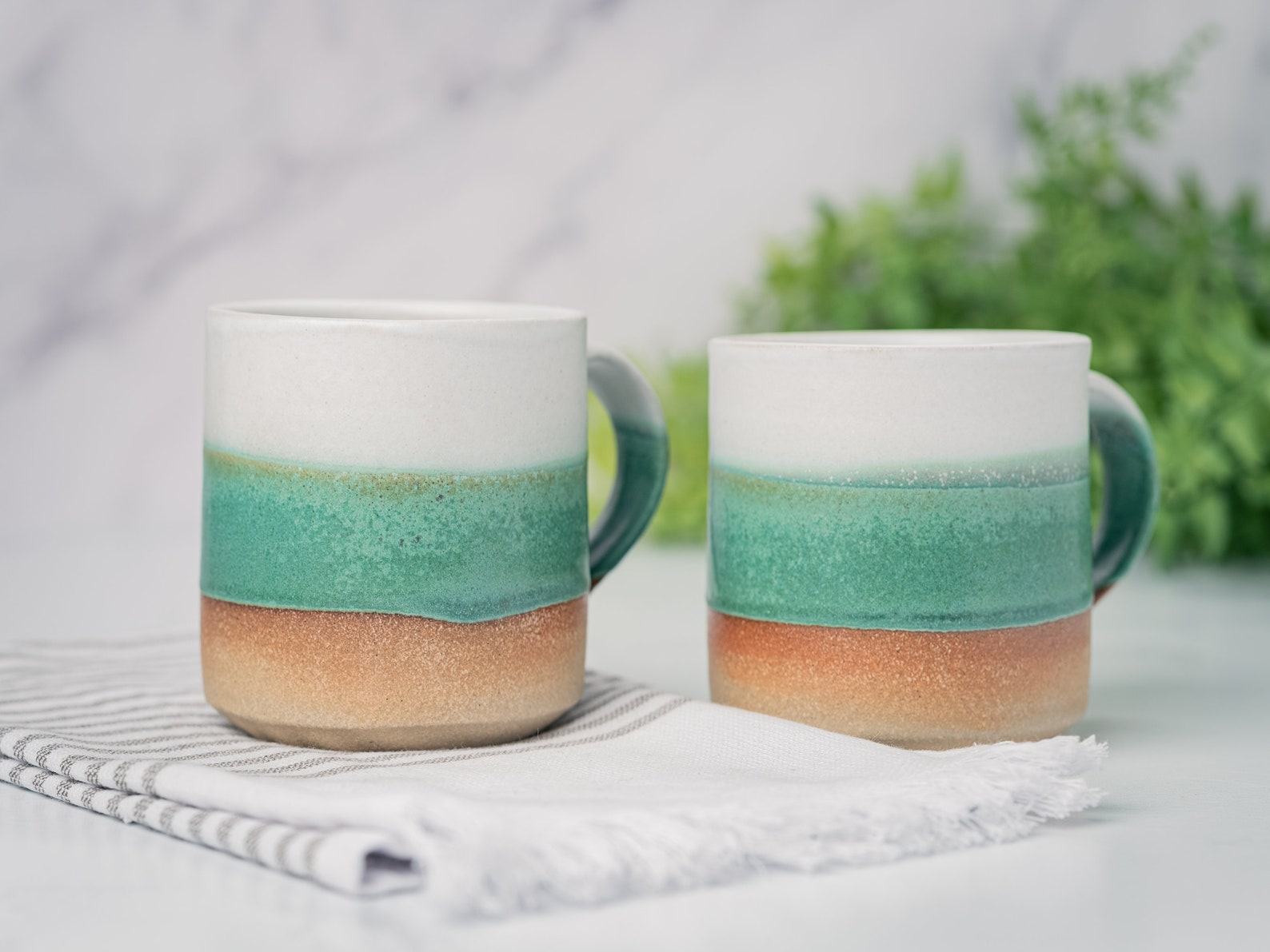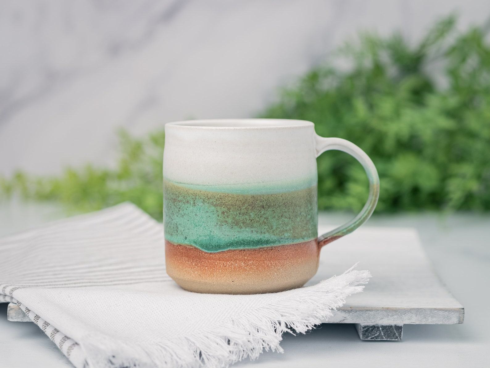 - Handcrafted stoneware mug adorned with an elegant white and green glaze