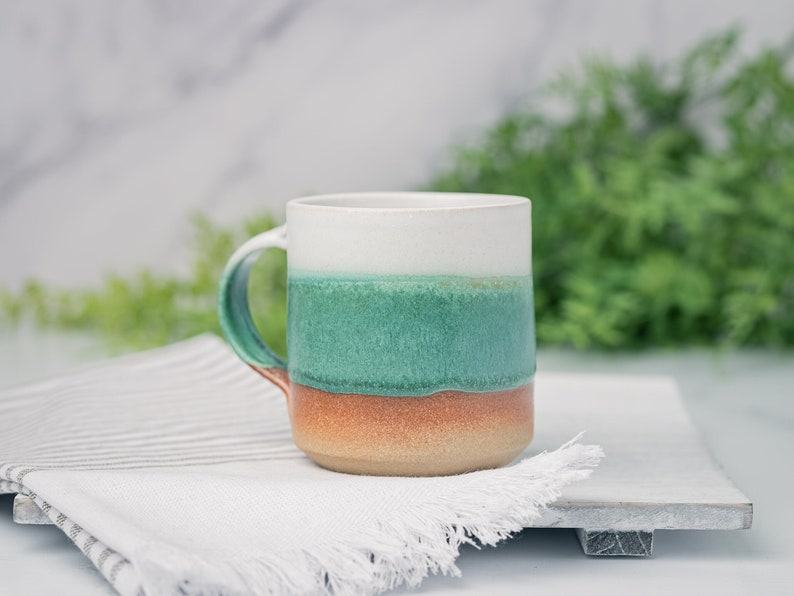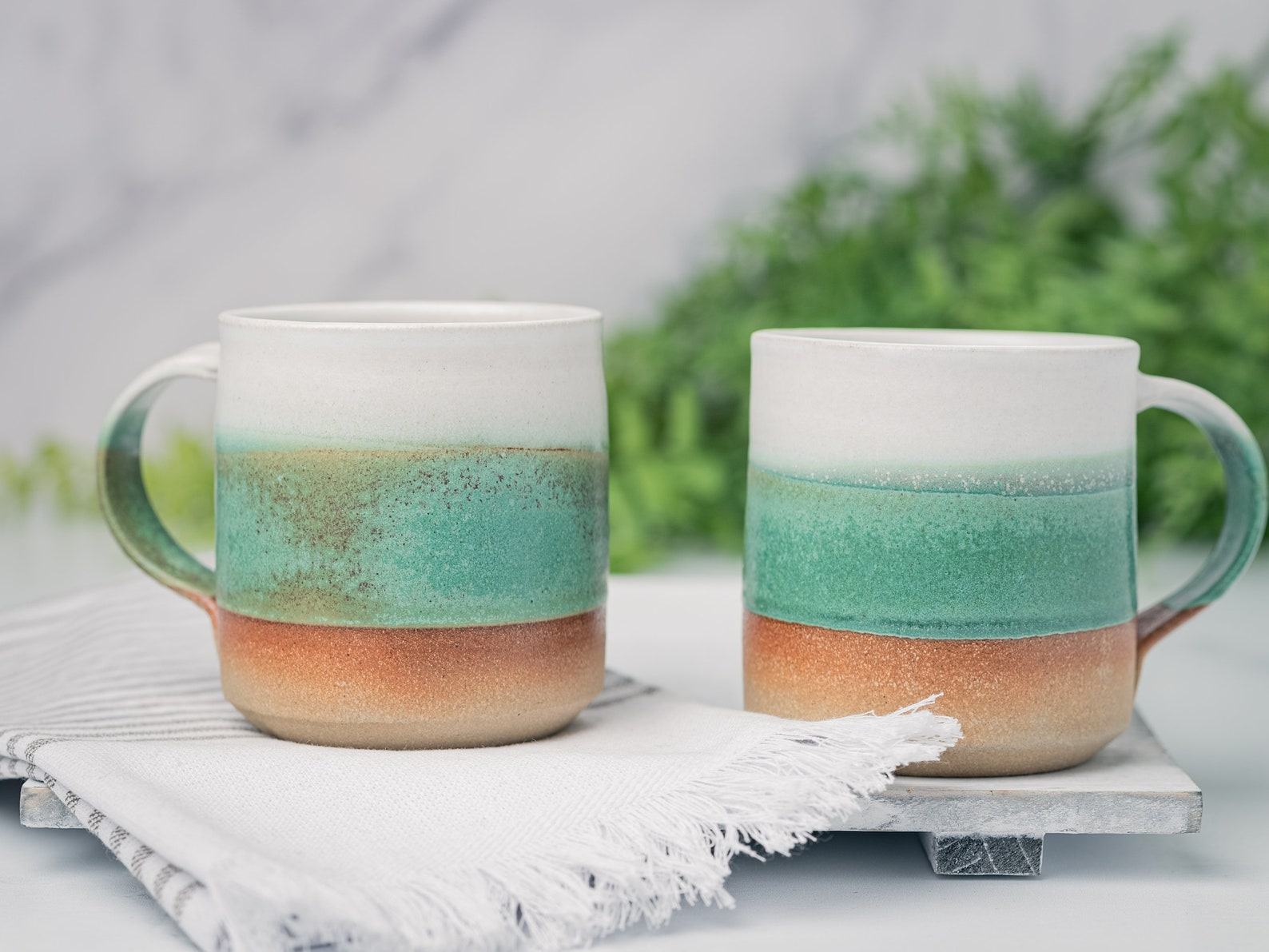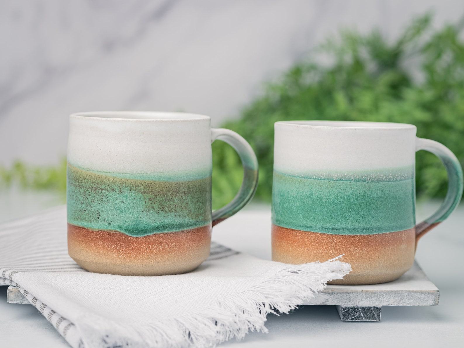 - Handcrafted stoneware mug adorned with an elegant white and green glaze
