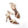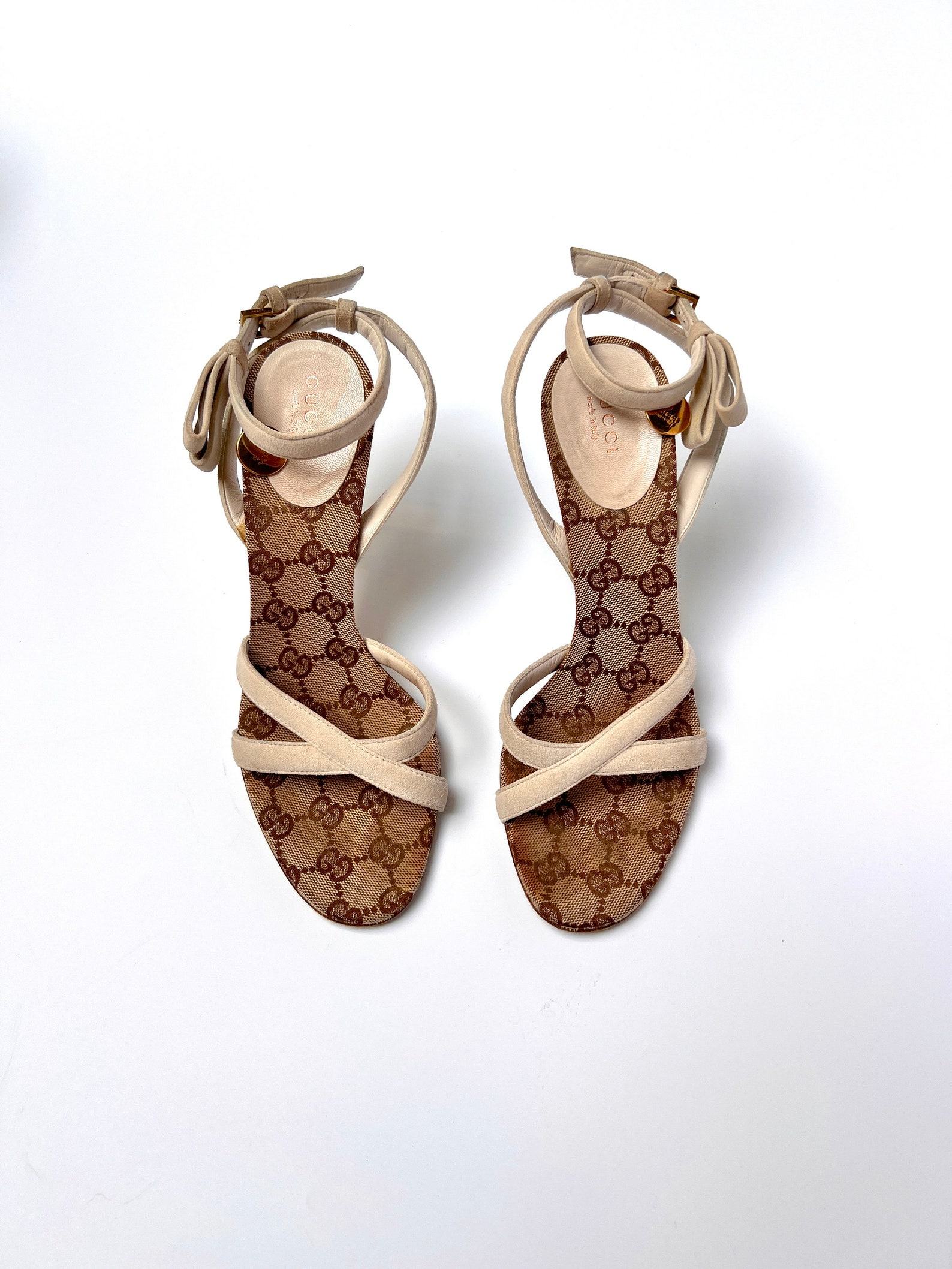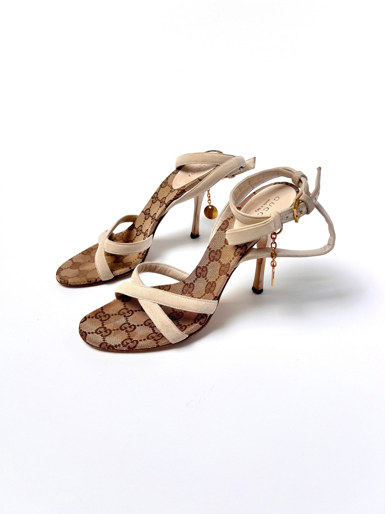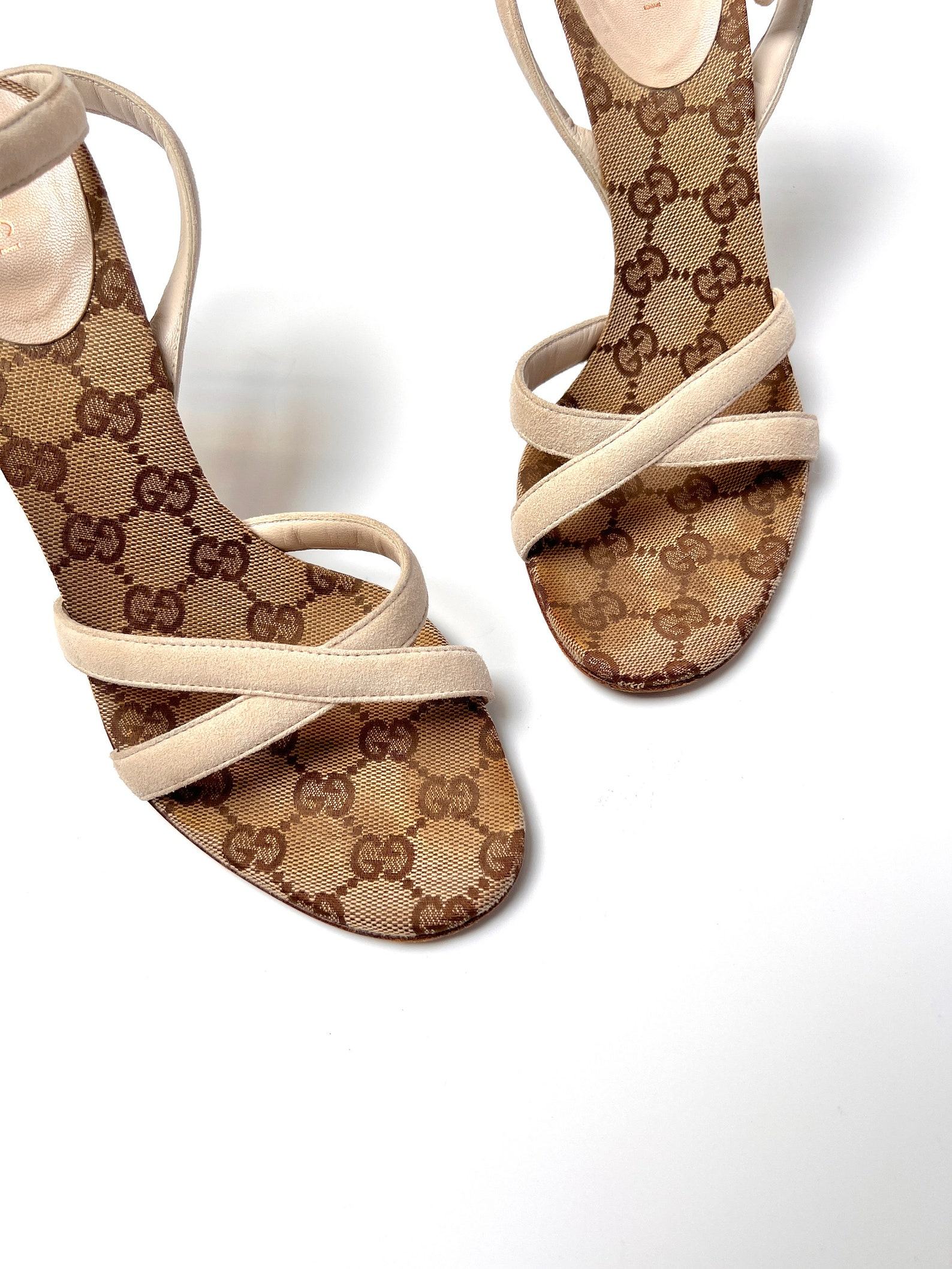 Authentic Gucci GG Monogram Canvas and Suede Strappy Stiletto Heels Sandals in Beige