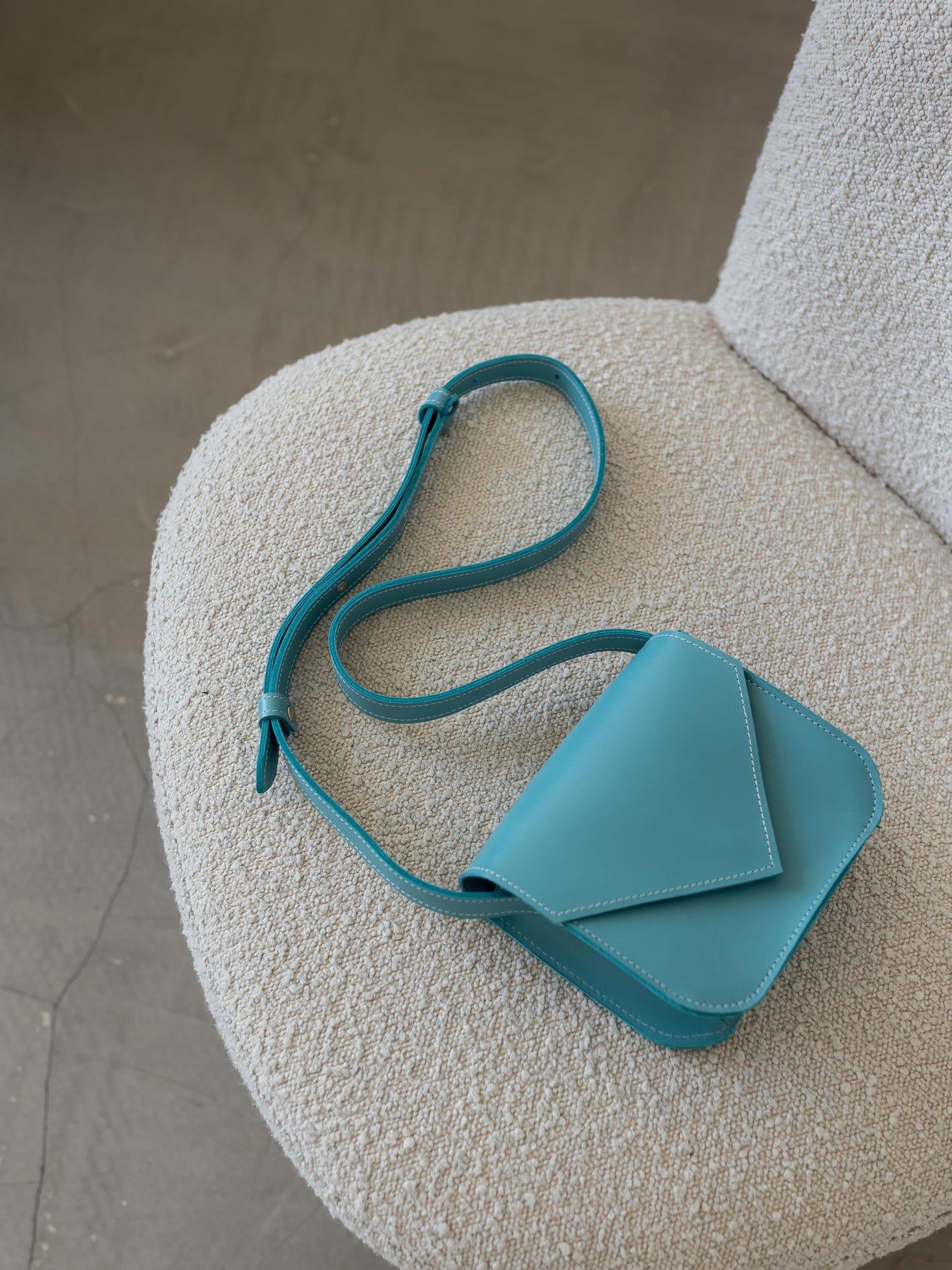 - Crafted from supple light blue leather, this crossbody purse exudes a timeless elegance.