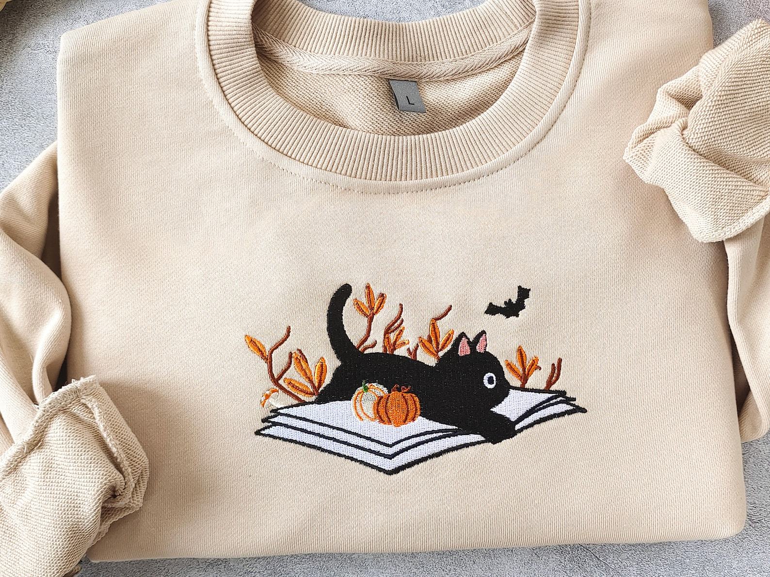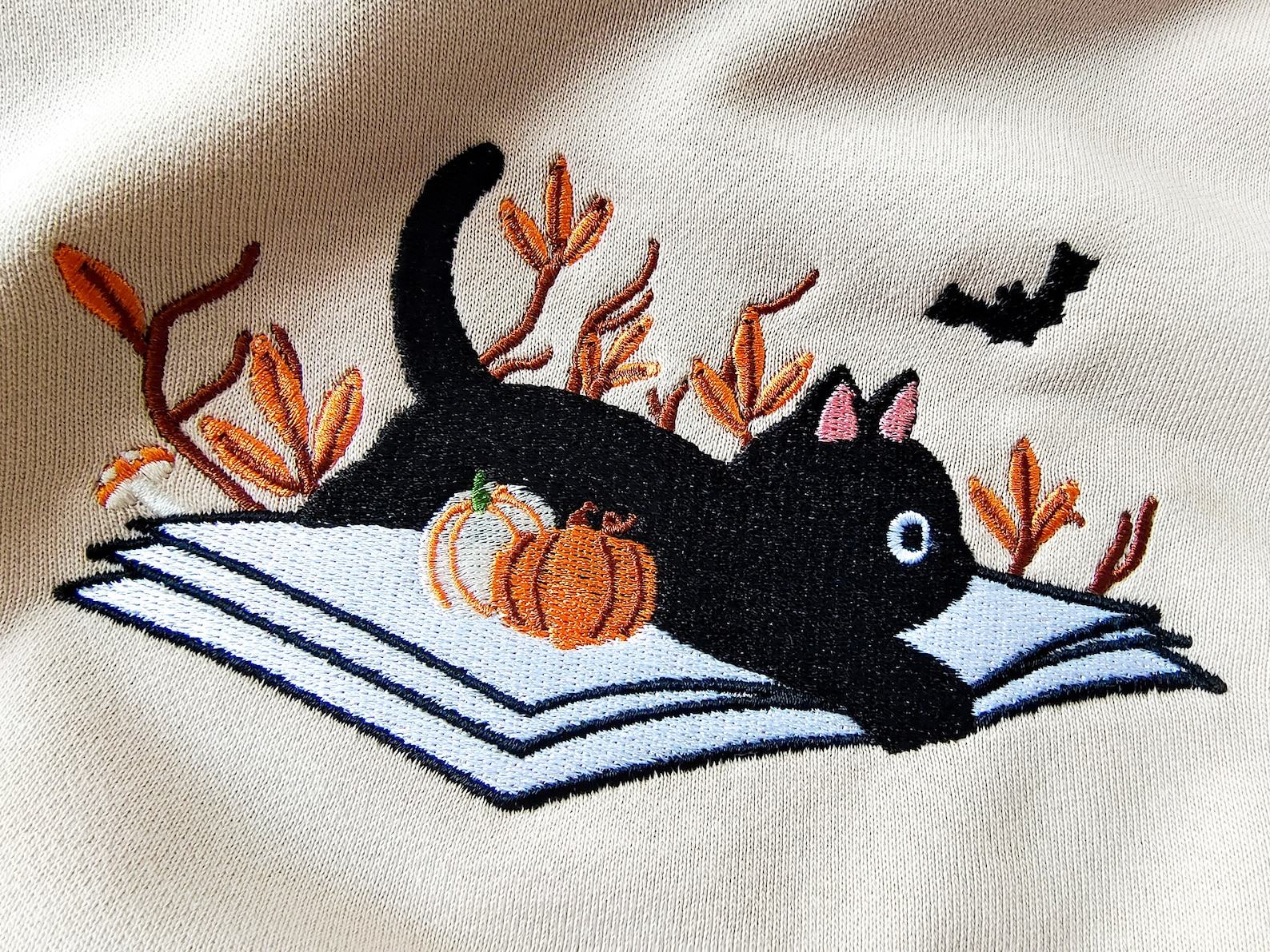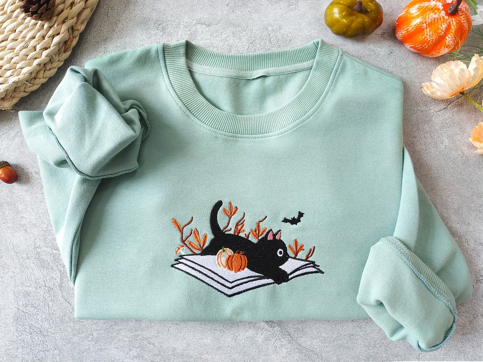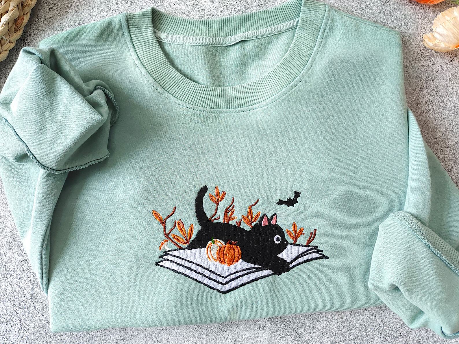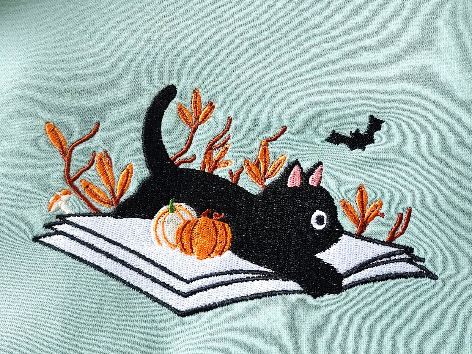 Bewitching Black Cat Embroidered Sweatshirt Spooky and Cozy for Fall