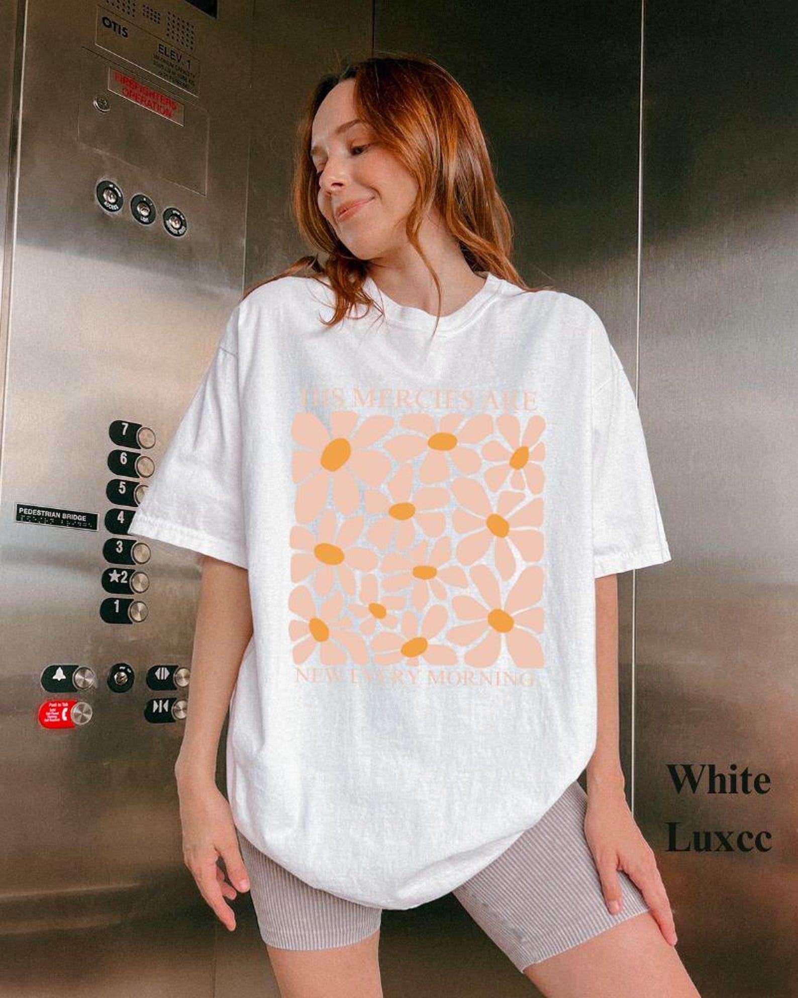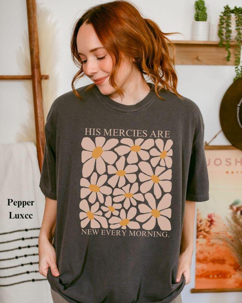 - Express your faith in style with this trendy Christian T-shirt featuring the uplifting message “His Mercies Are New Every Morning.”