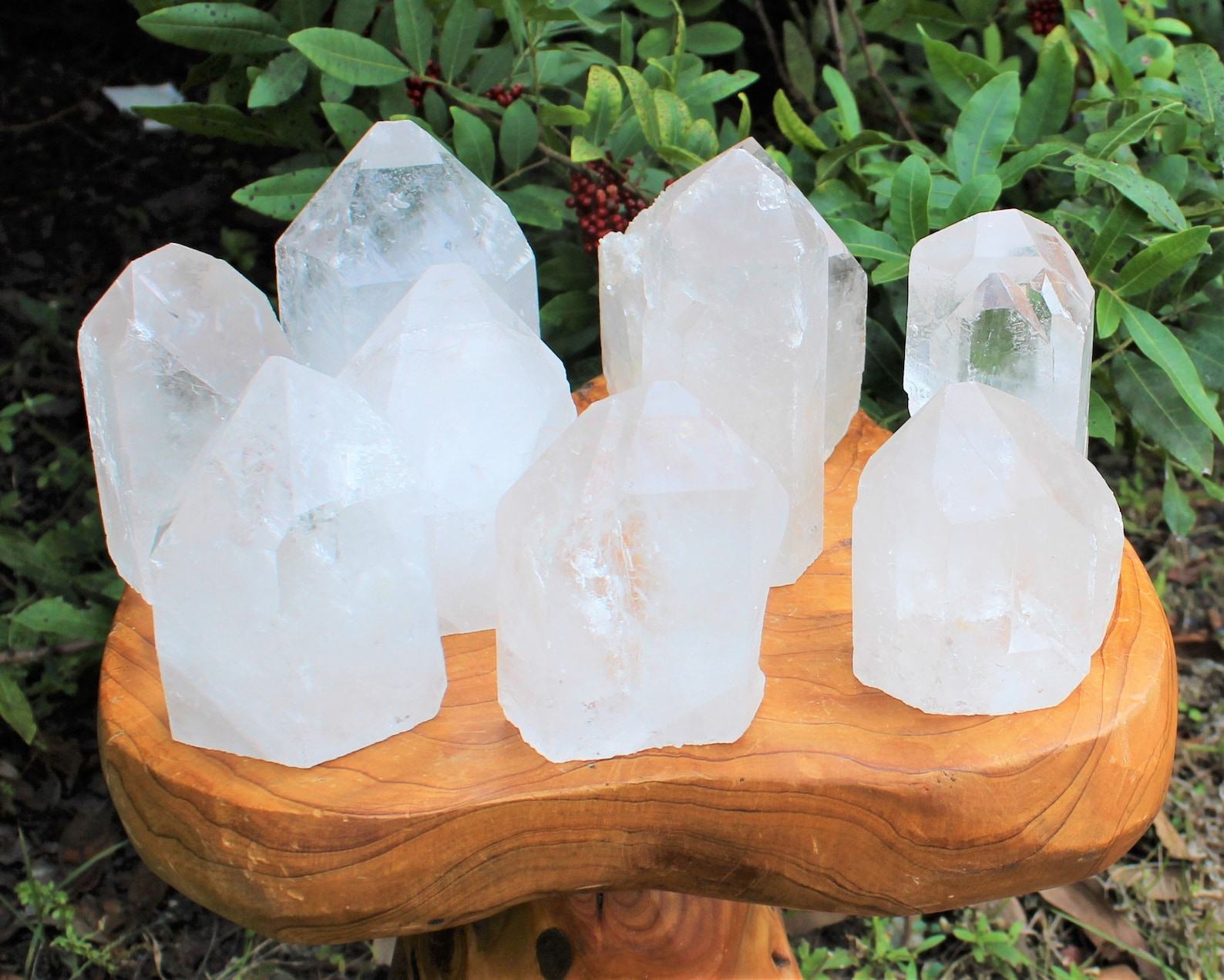 - Large, clear quartz crystal point with a cut base for stability