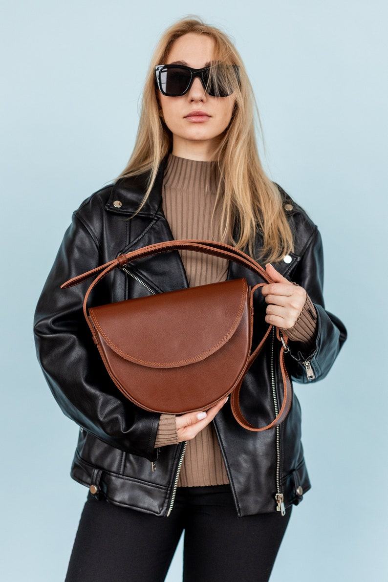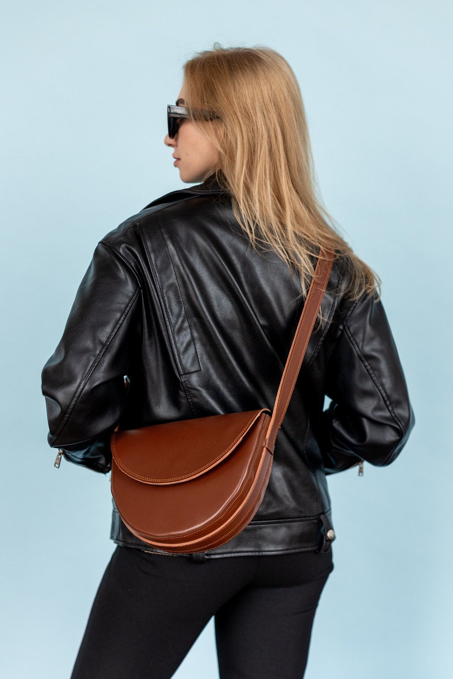 - Premium leather half-moon bag with a spacious interior for everyday essentials