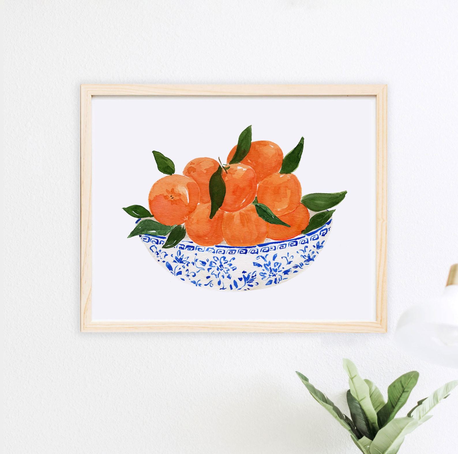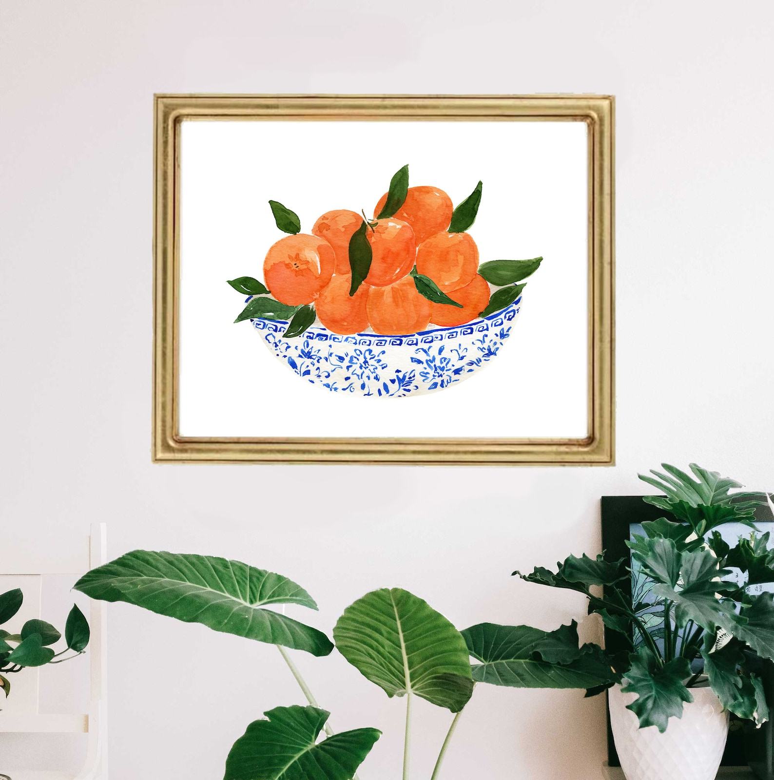 - Delightful print featuring oranges nestled in a charming blue and white bowl, evoking a classic Delftware aesthetic.
