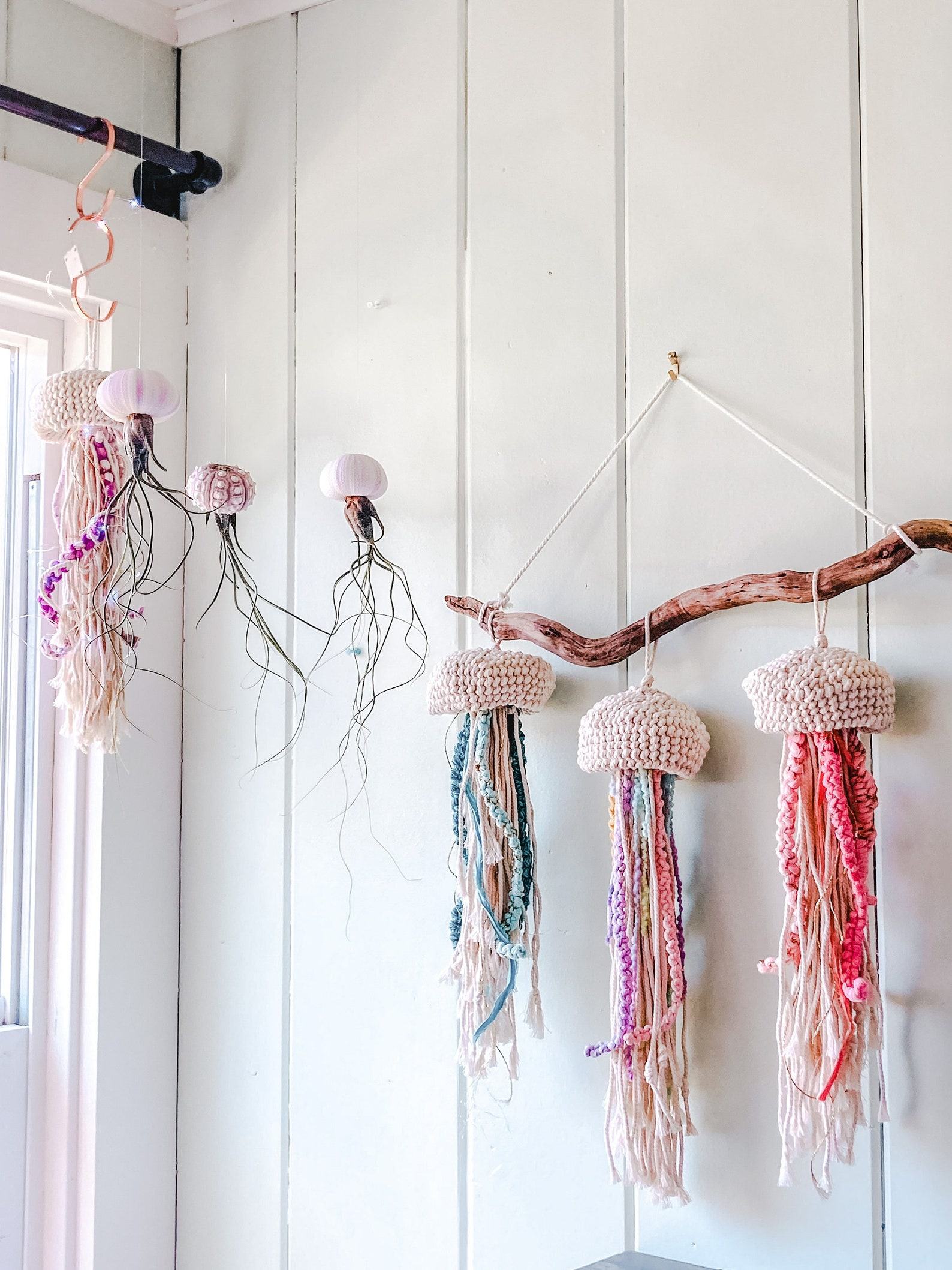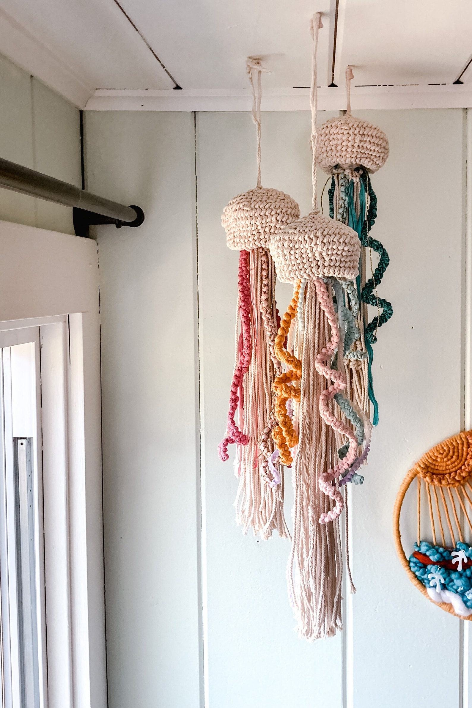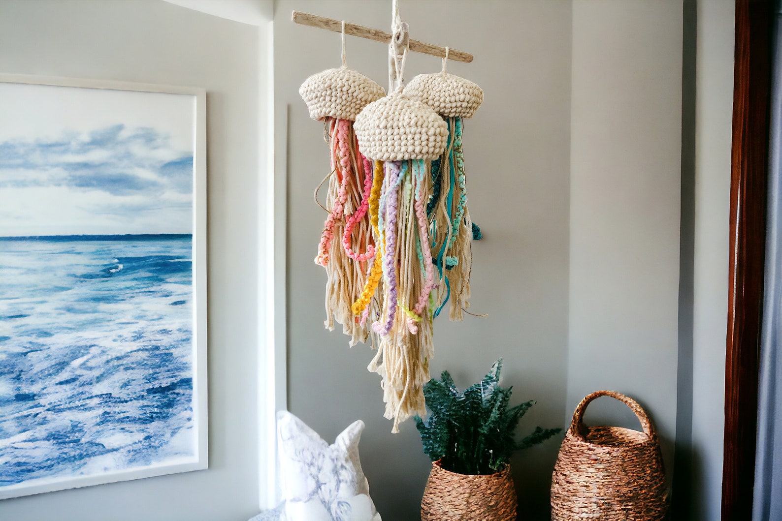 - Handcrafted macrame jellyfish wall hanging, adding a touch of coastal charm to any space.