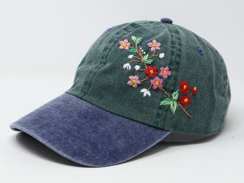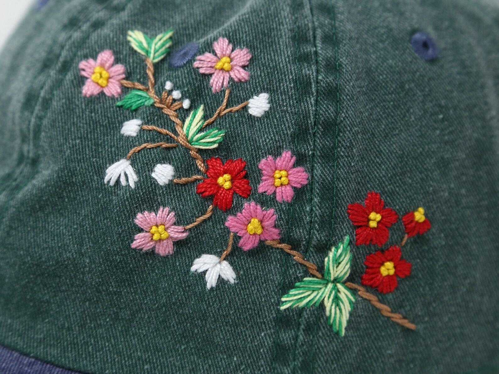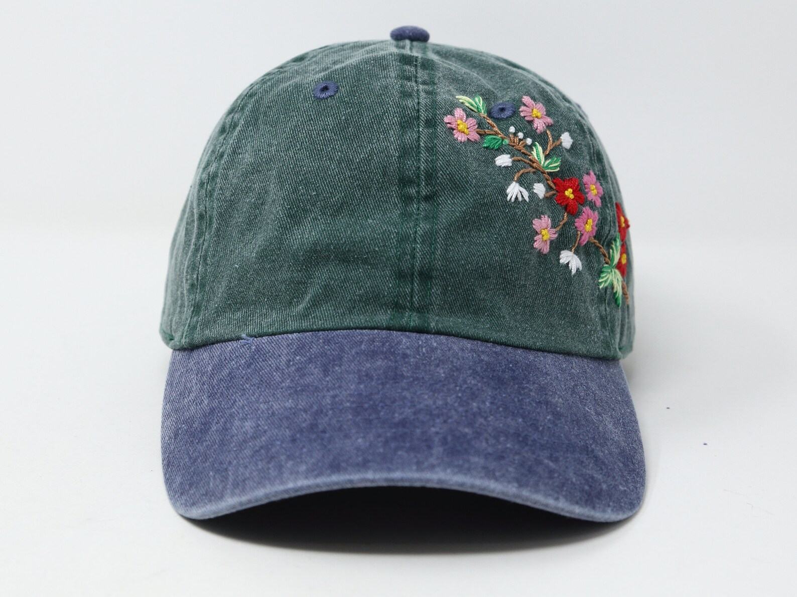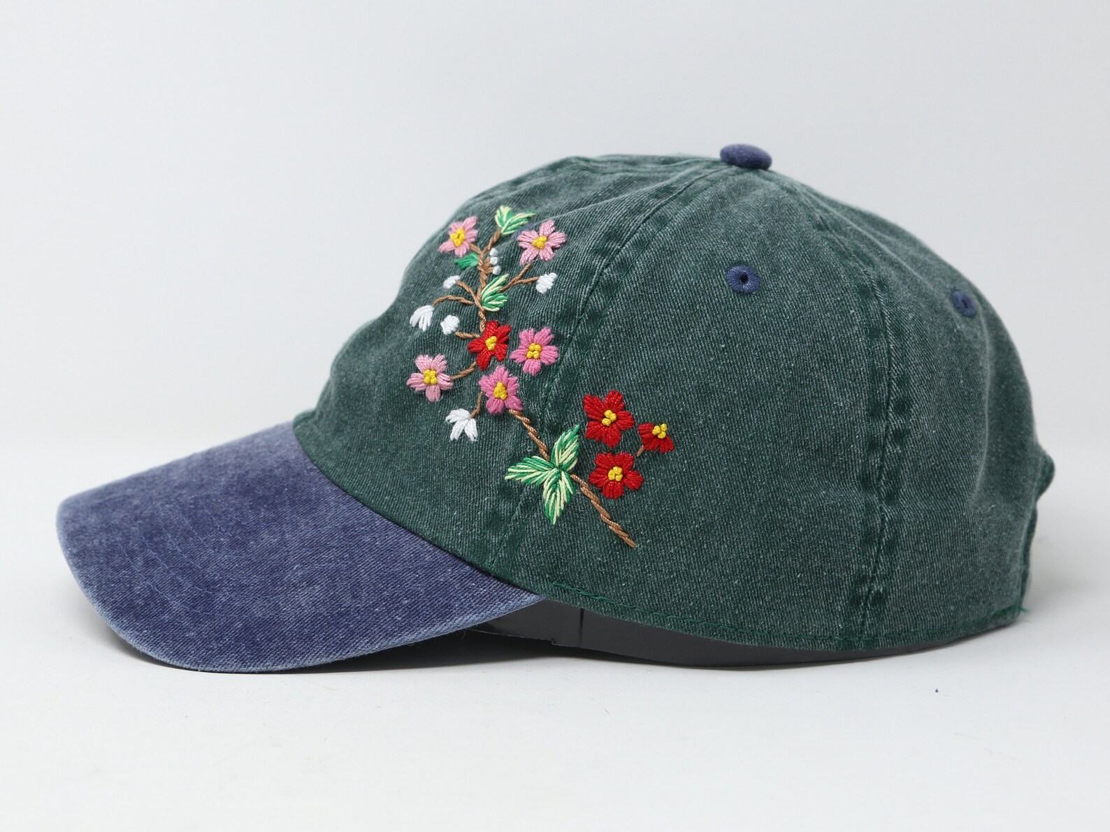 Embroidered Floral Baseball Cap Summer Sun Hat with Handcrafted Pink and Red Flowers