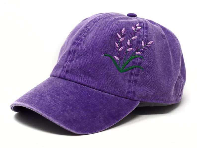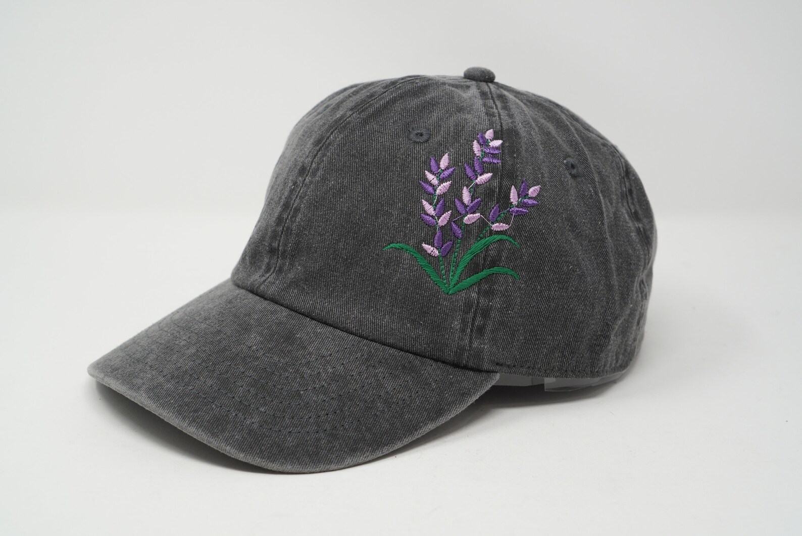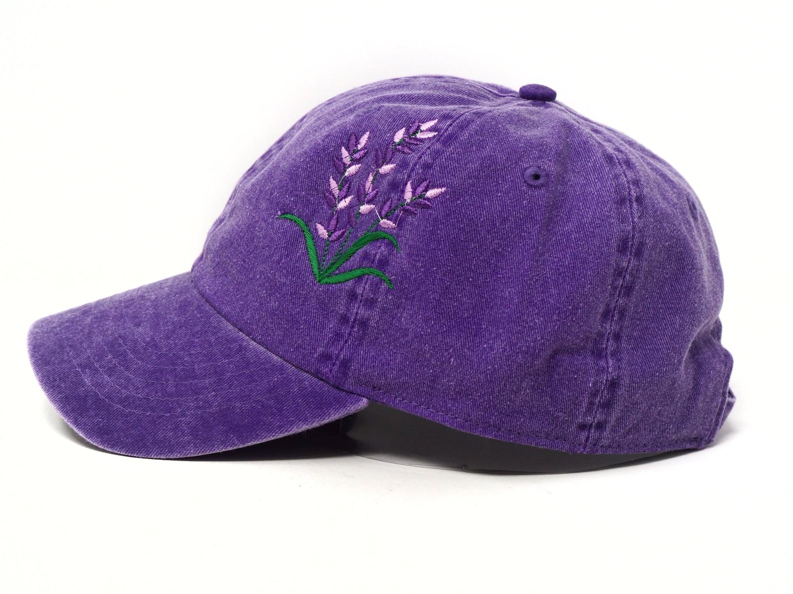 - Embroidered lavender flowers add a touch of elegance to this baseball cap.
