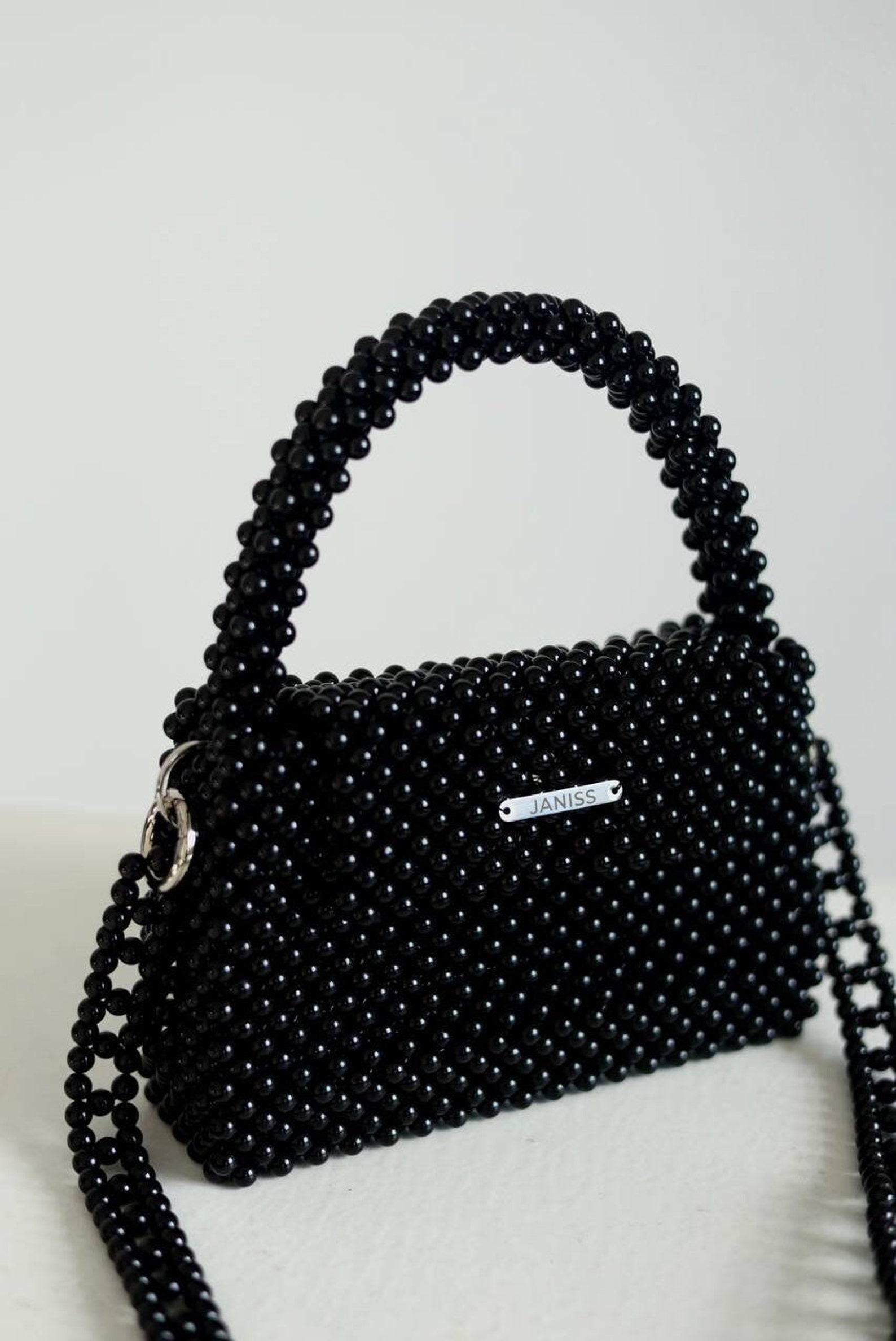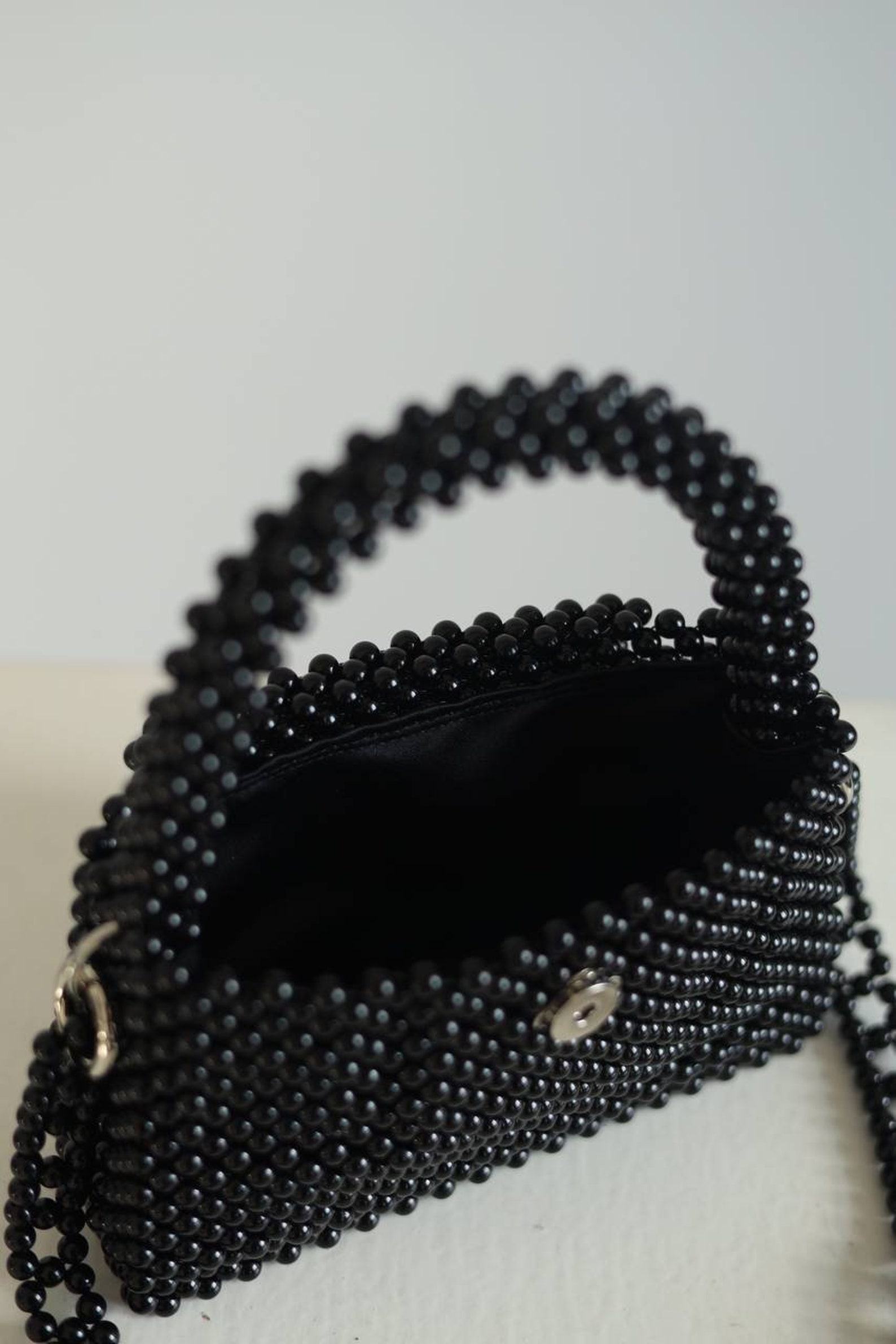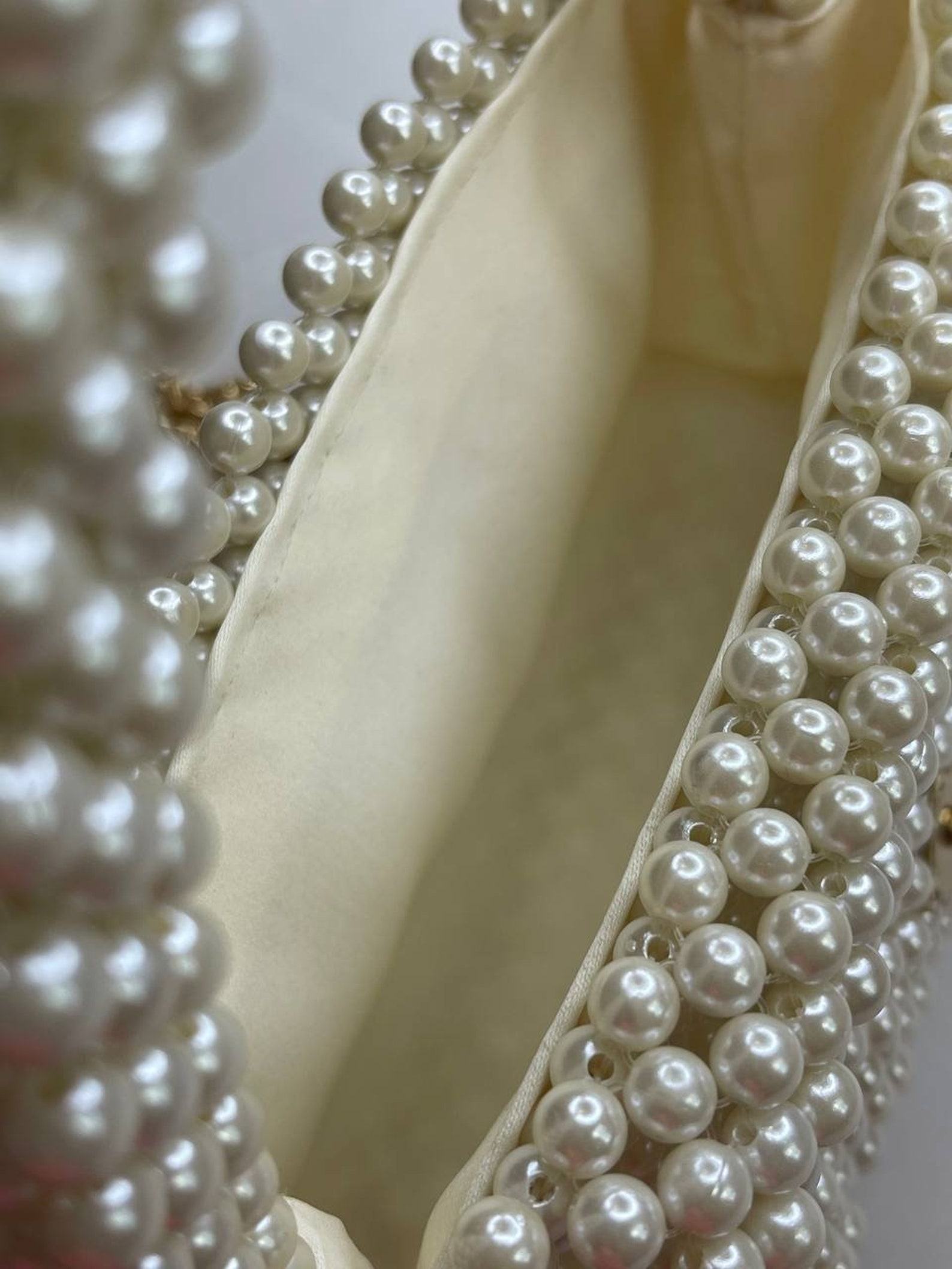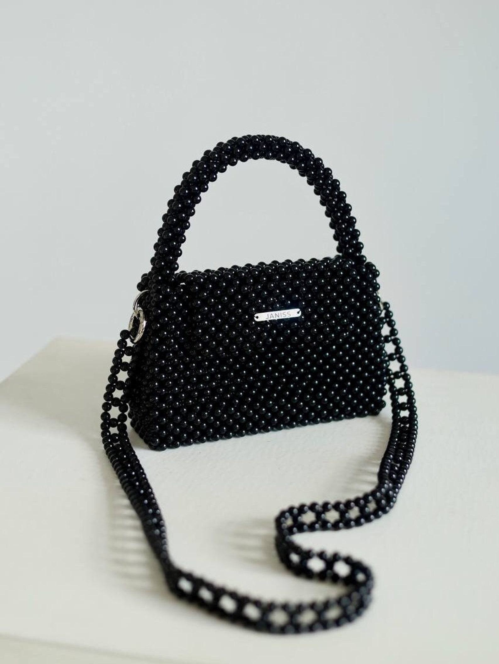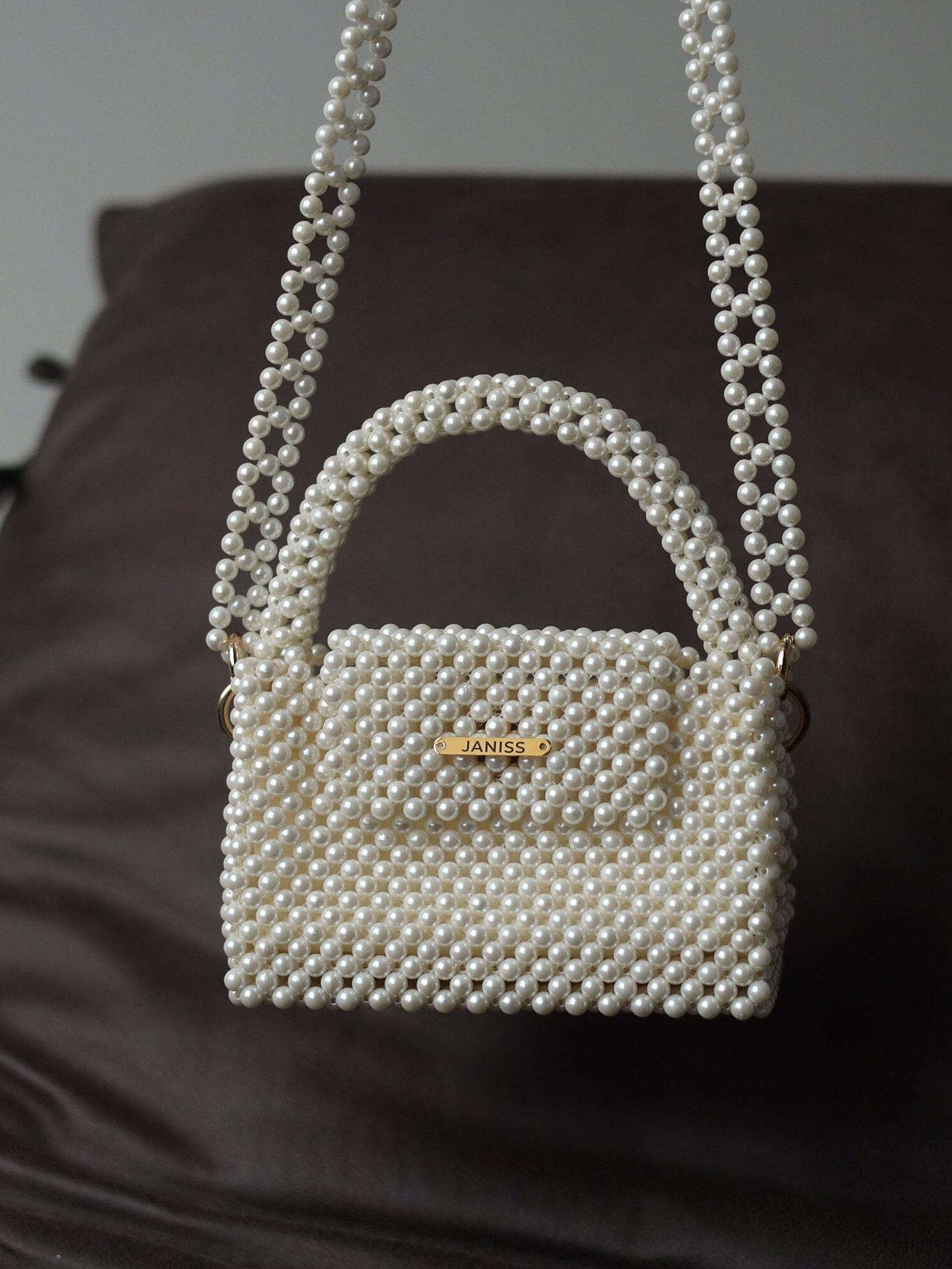 - Handcrafted beaded pearl bag, meticulously adorned with lustrous faux pearls for a timeless and elegant look.