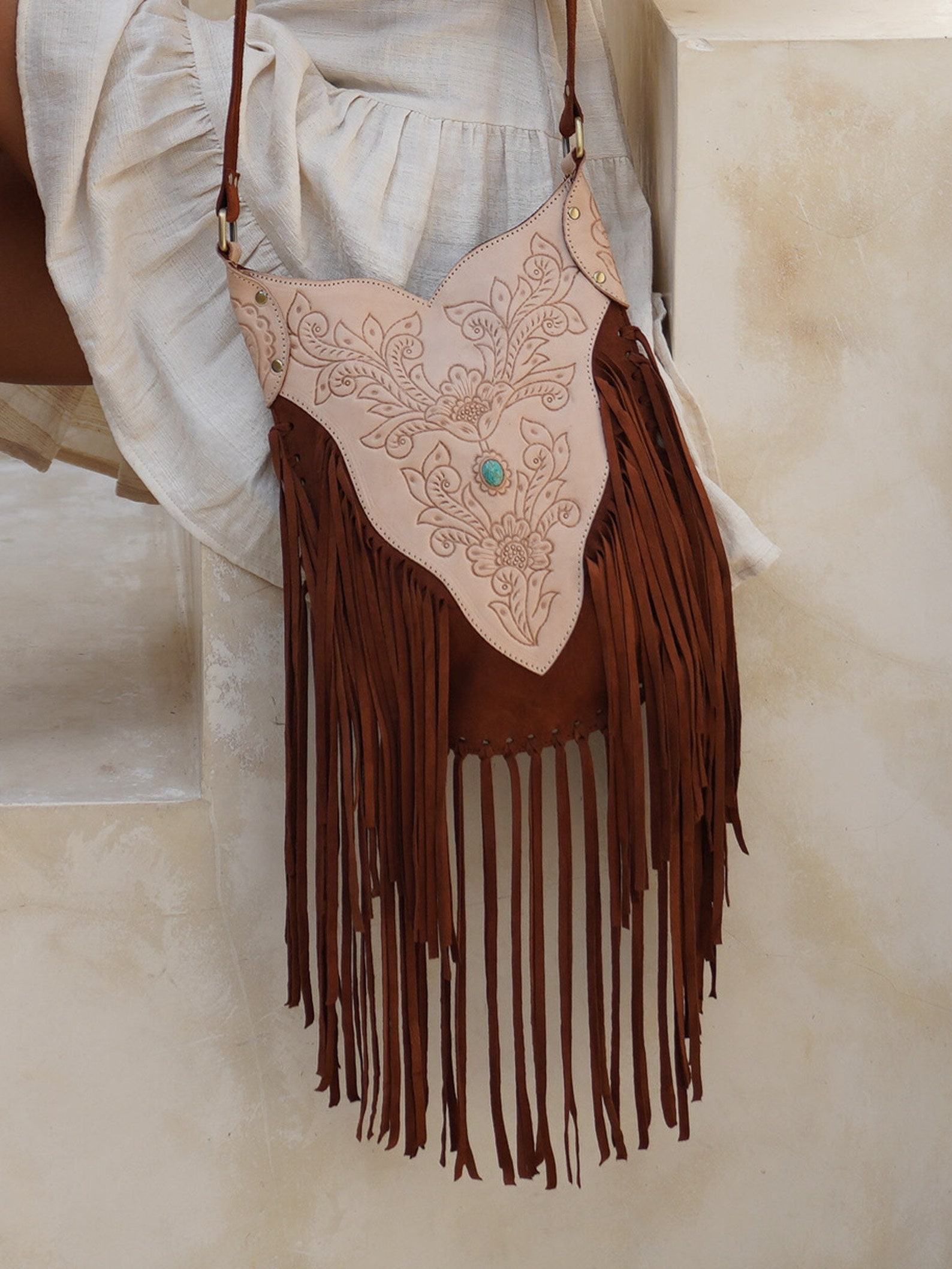 Exquisite Bohemian Brown Leather Fringe Carved Crossbody A Western Purse with Unparalleled Charm $34.76