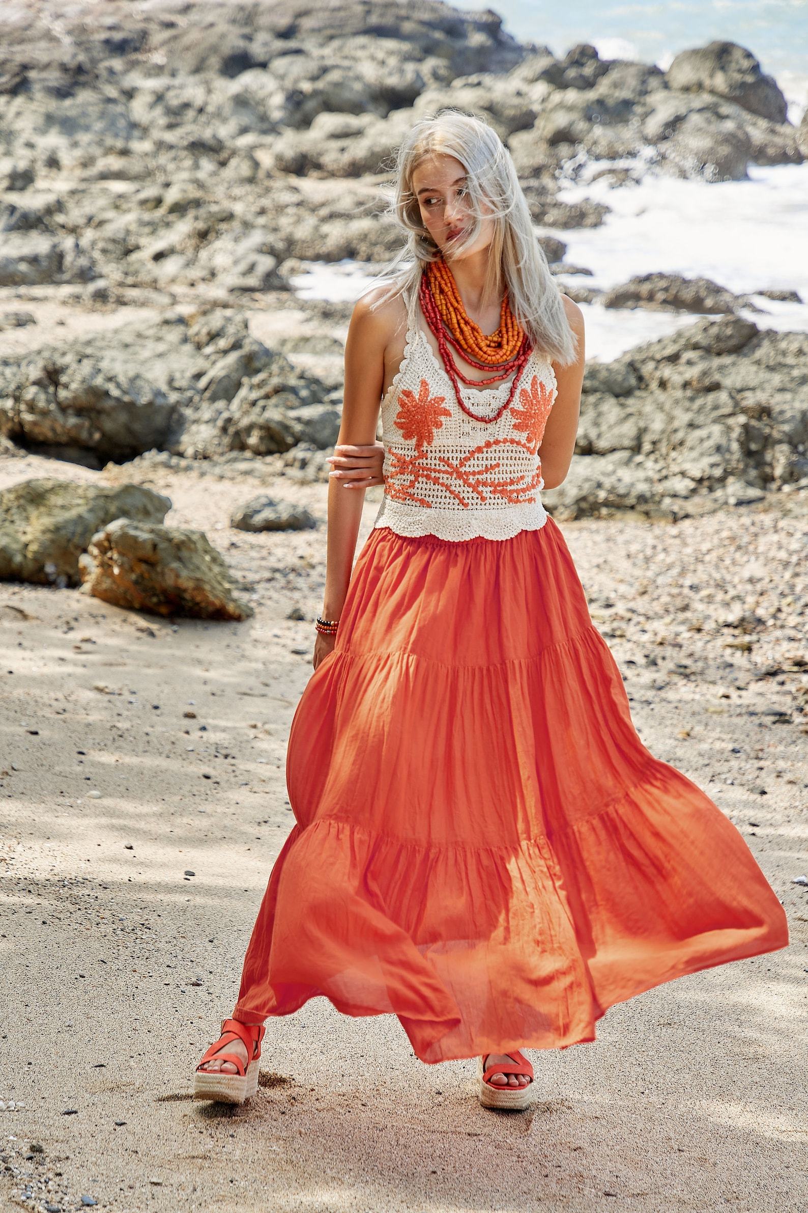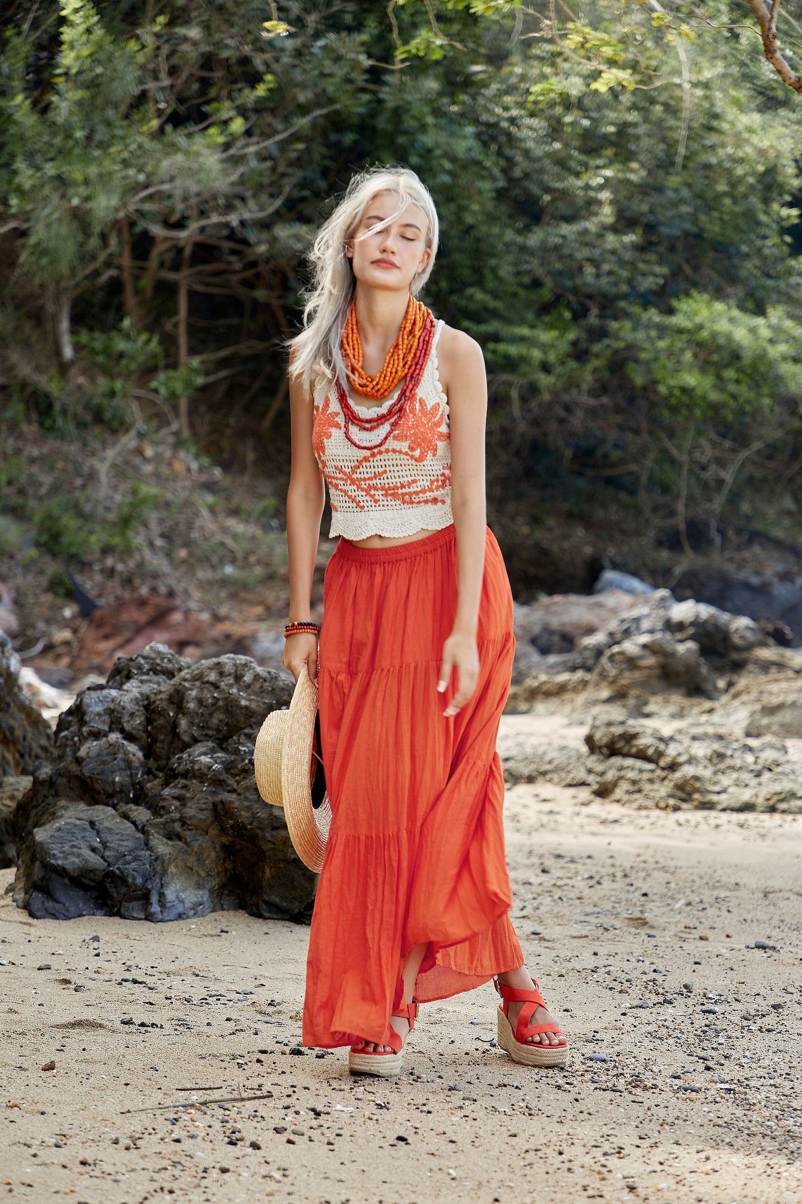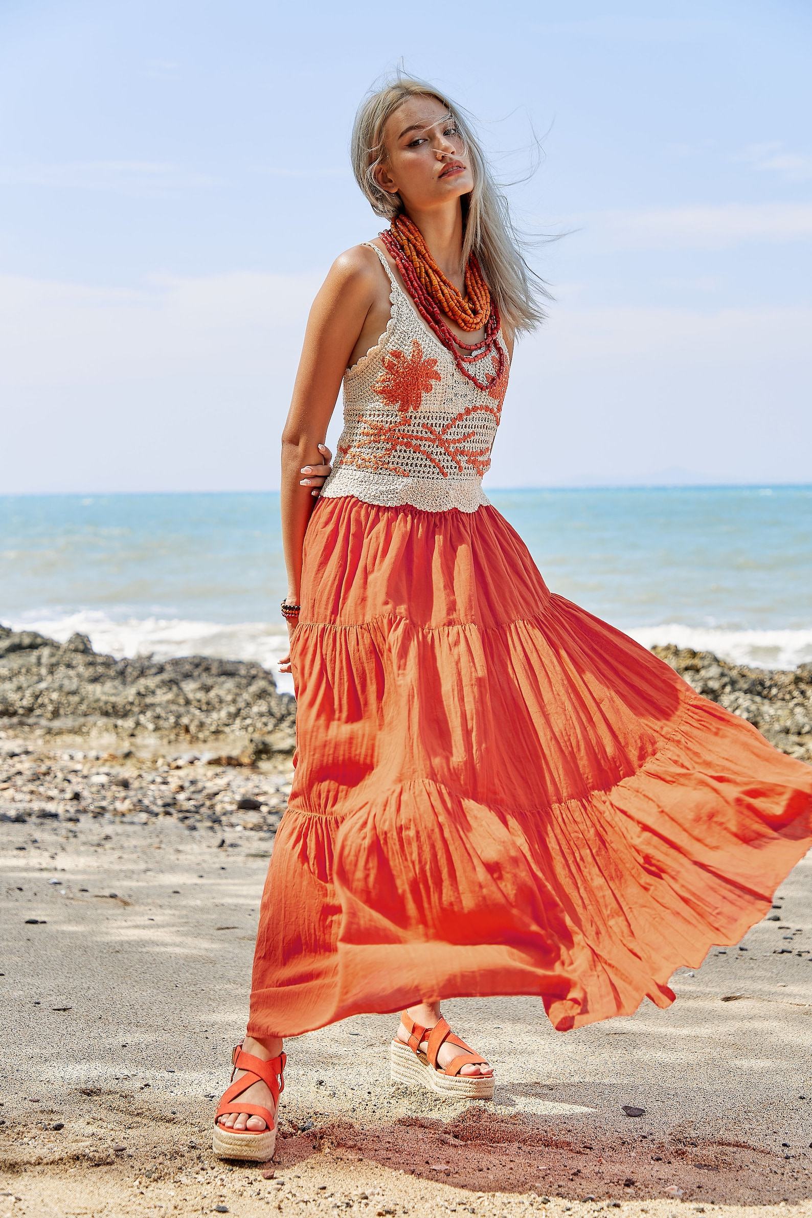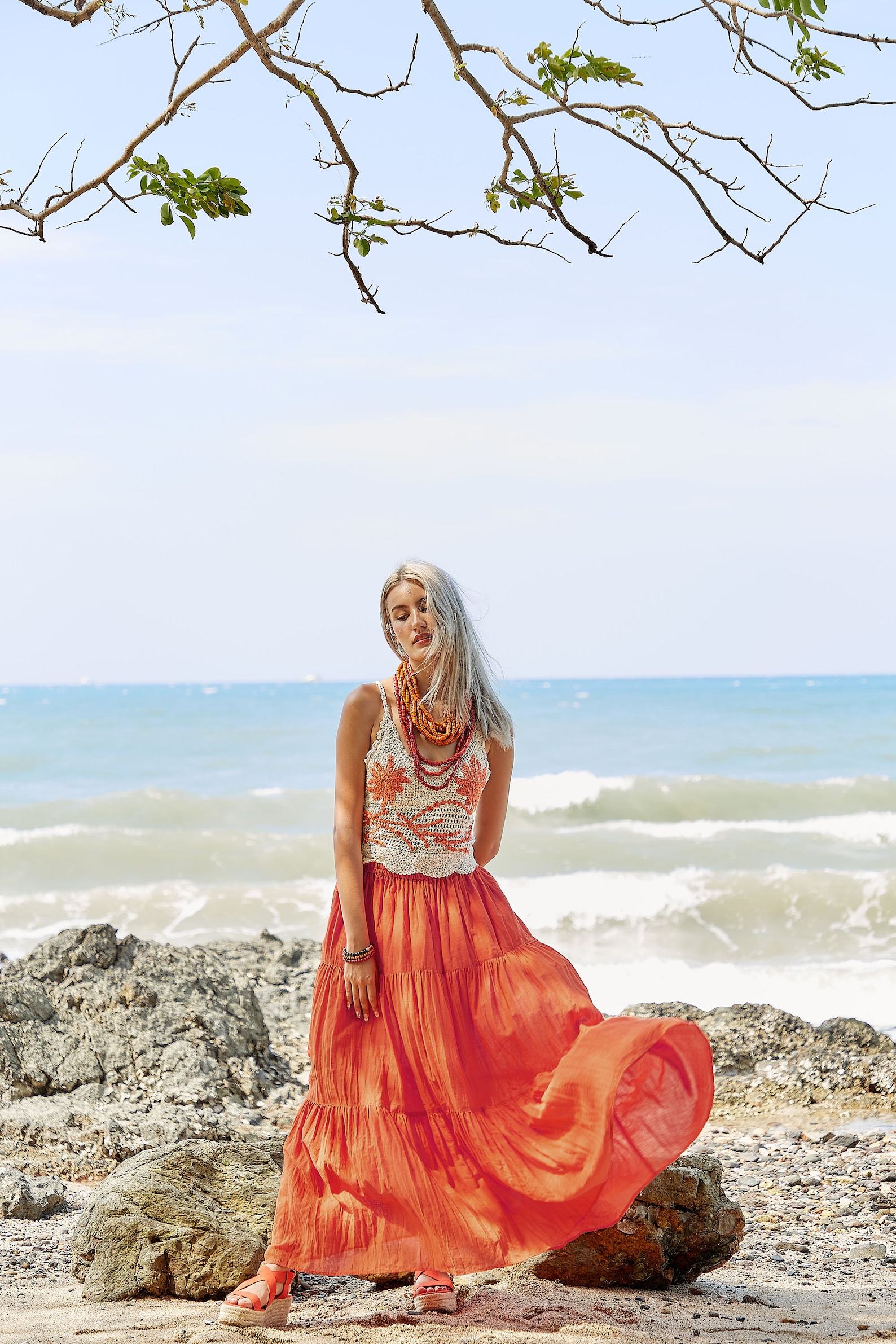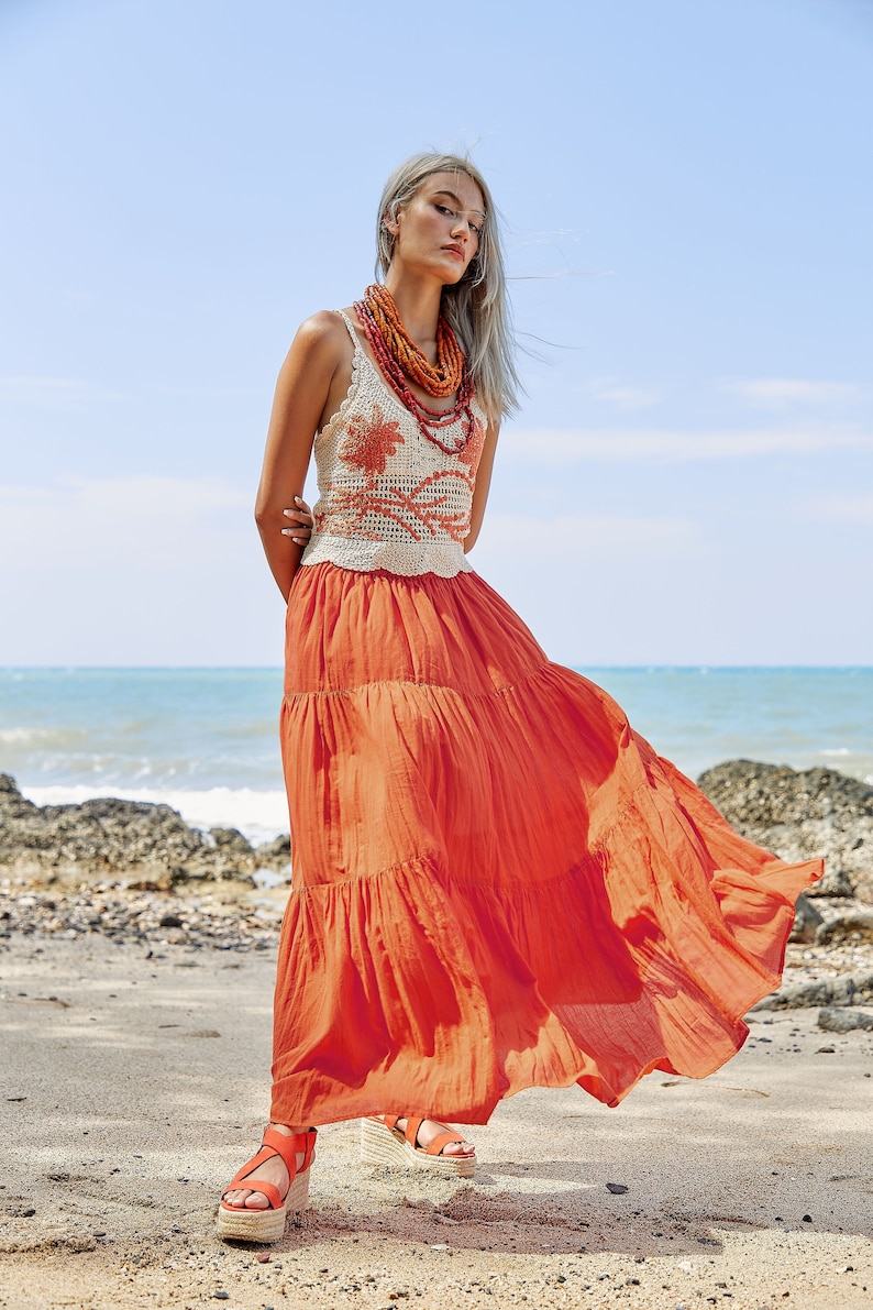 - Flowy and feminine tiered peasant skirt in a vibrant orange hue