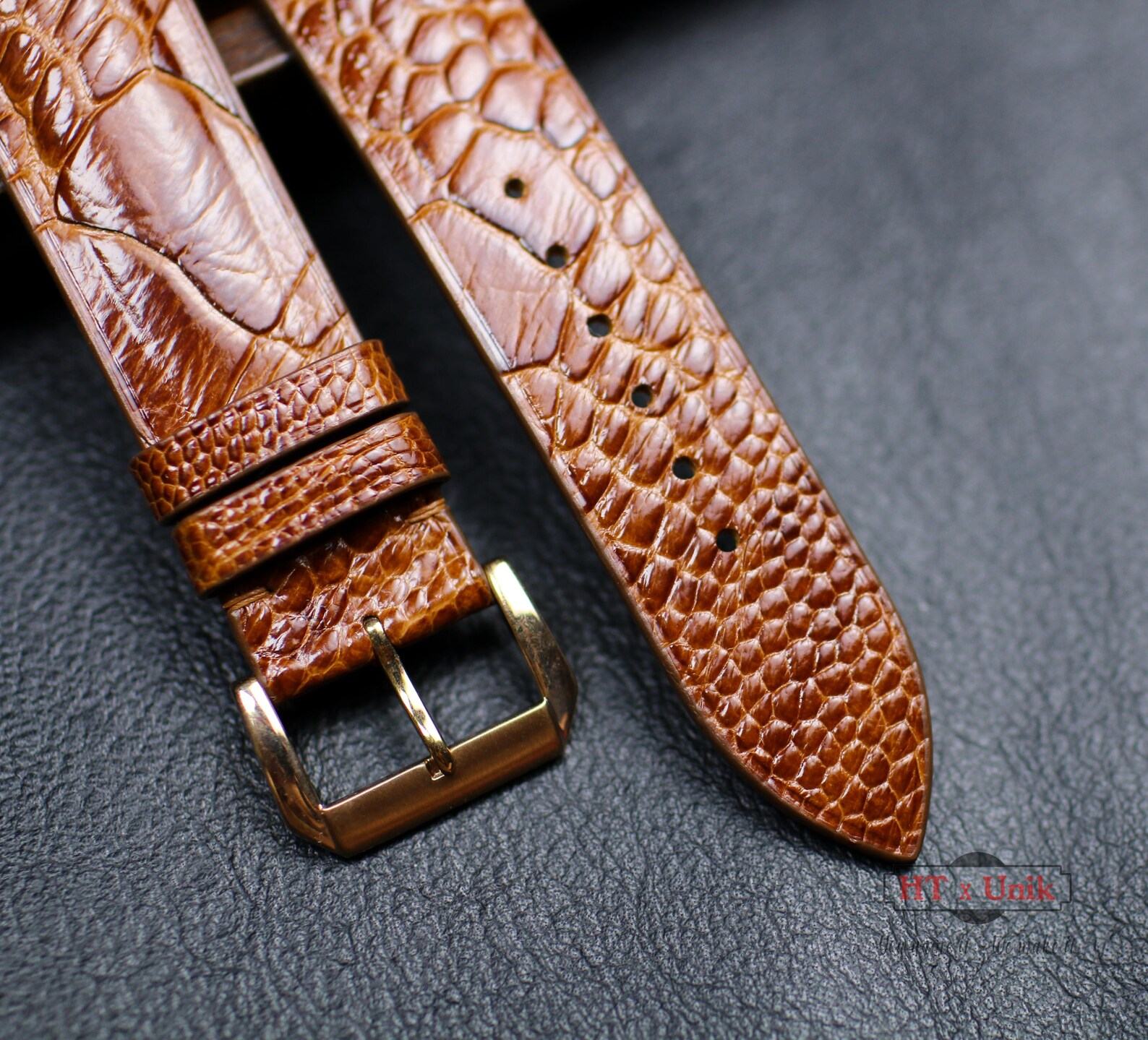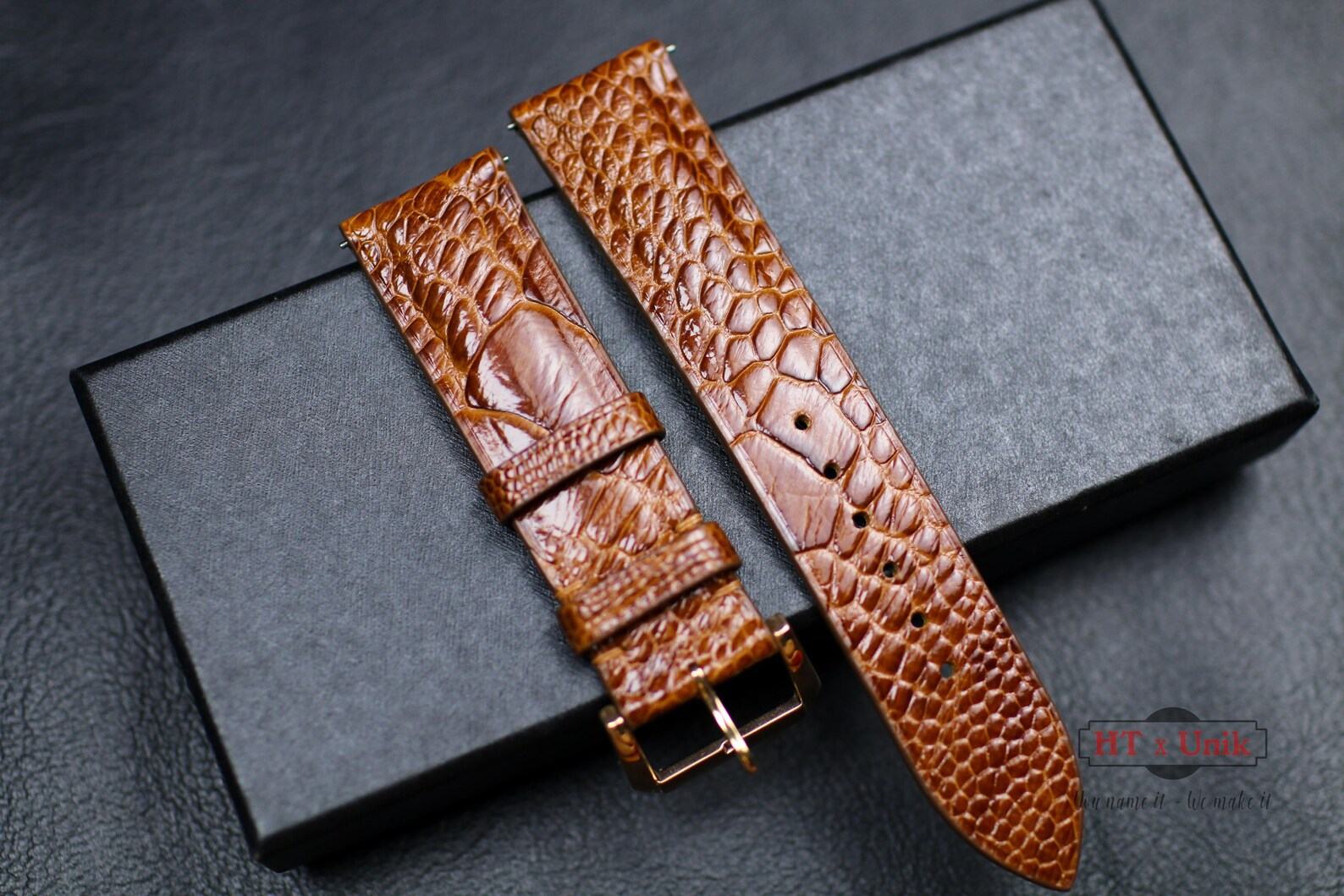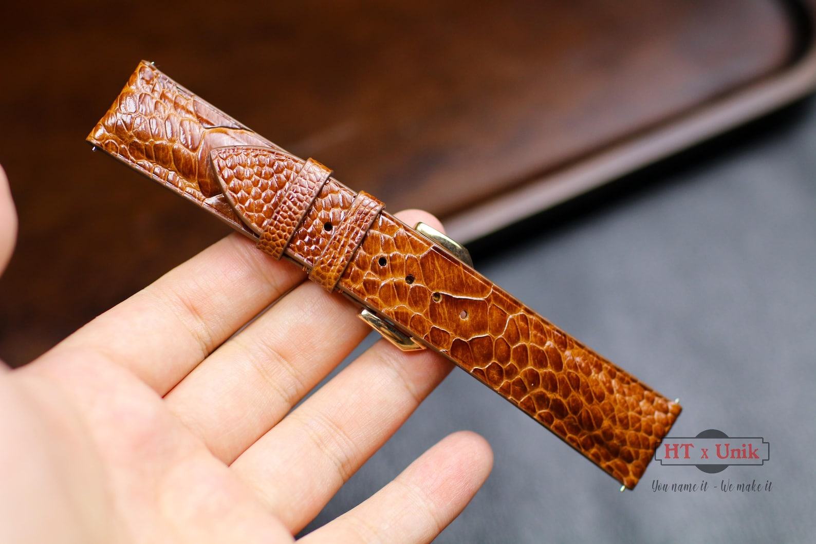 - Genuine ostrich foot leather watch band with a unique stitchless design.
