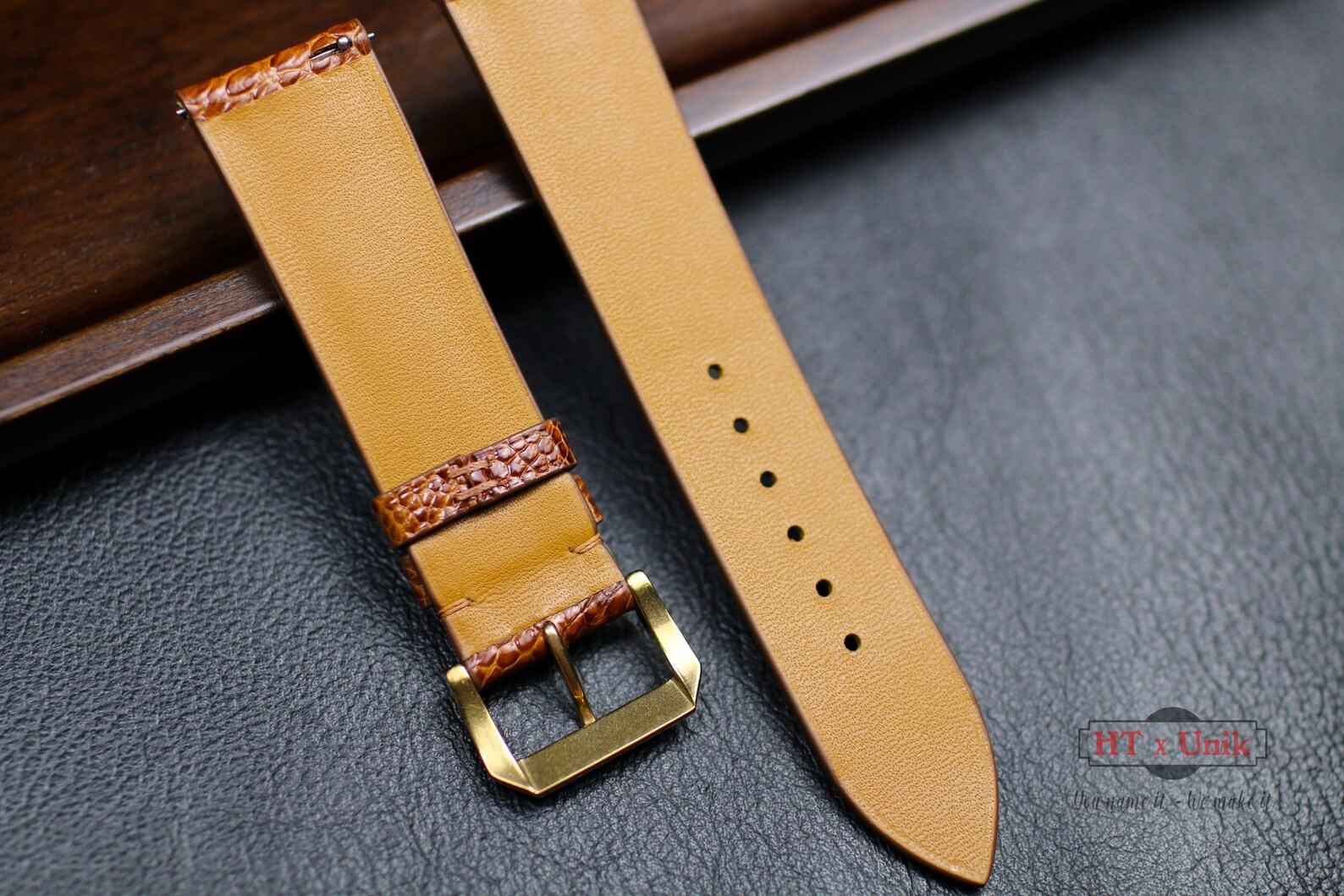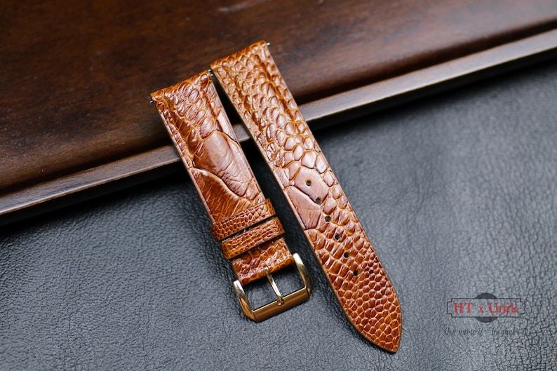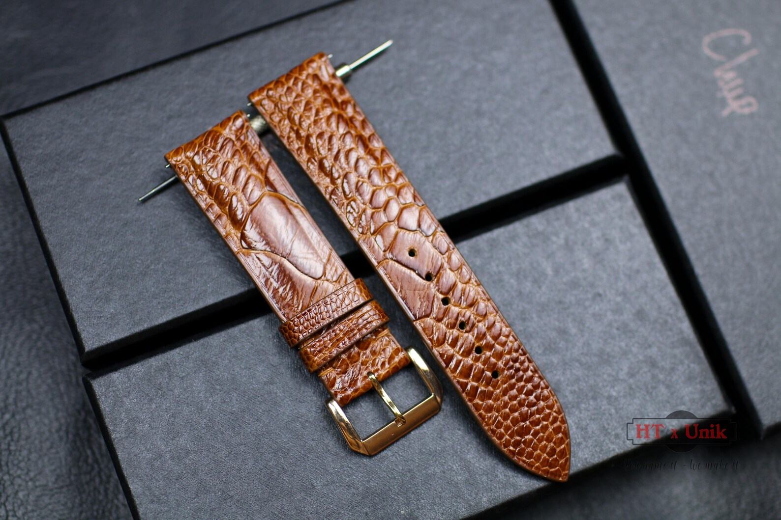 - Genuine ostrich foot leather watch band with a unique stitchless design.