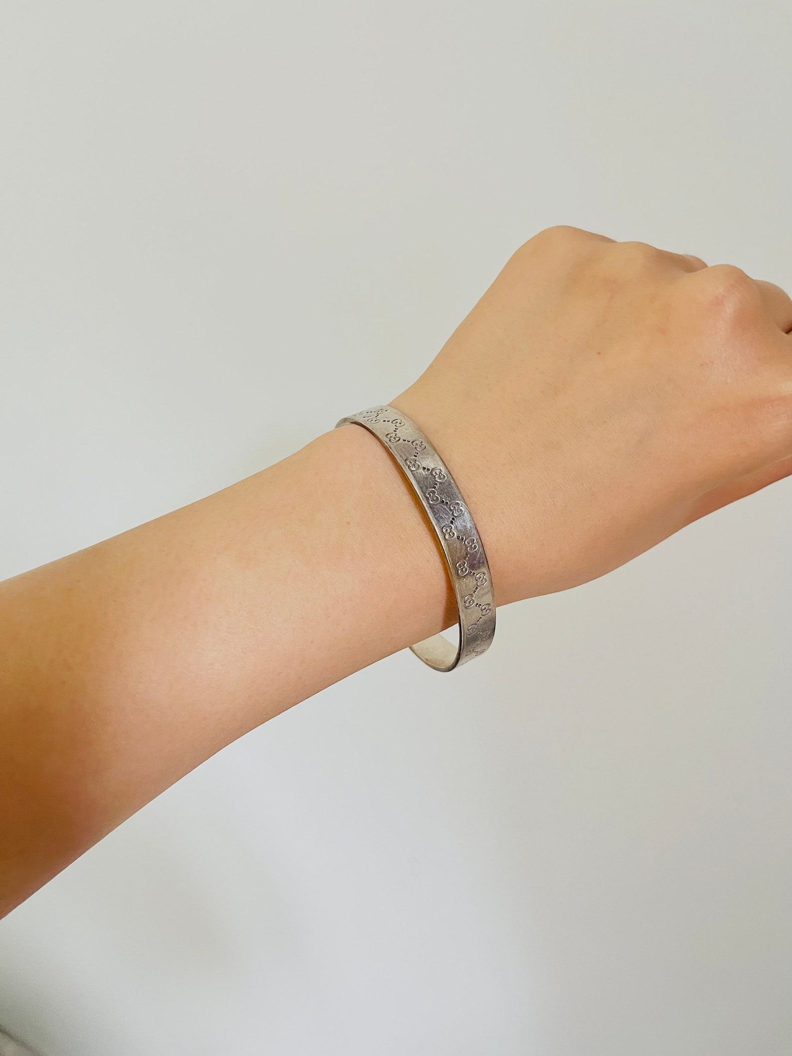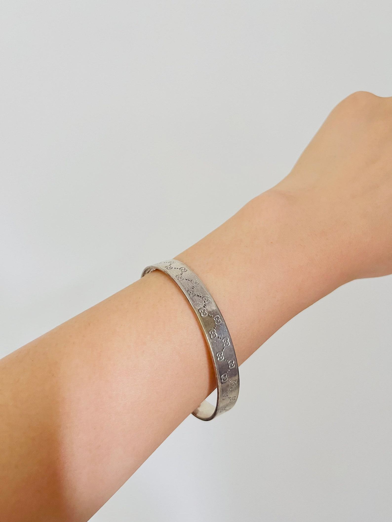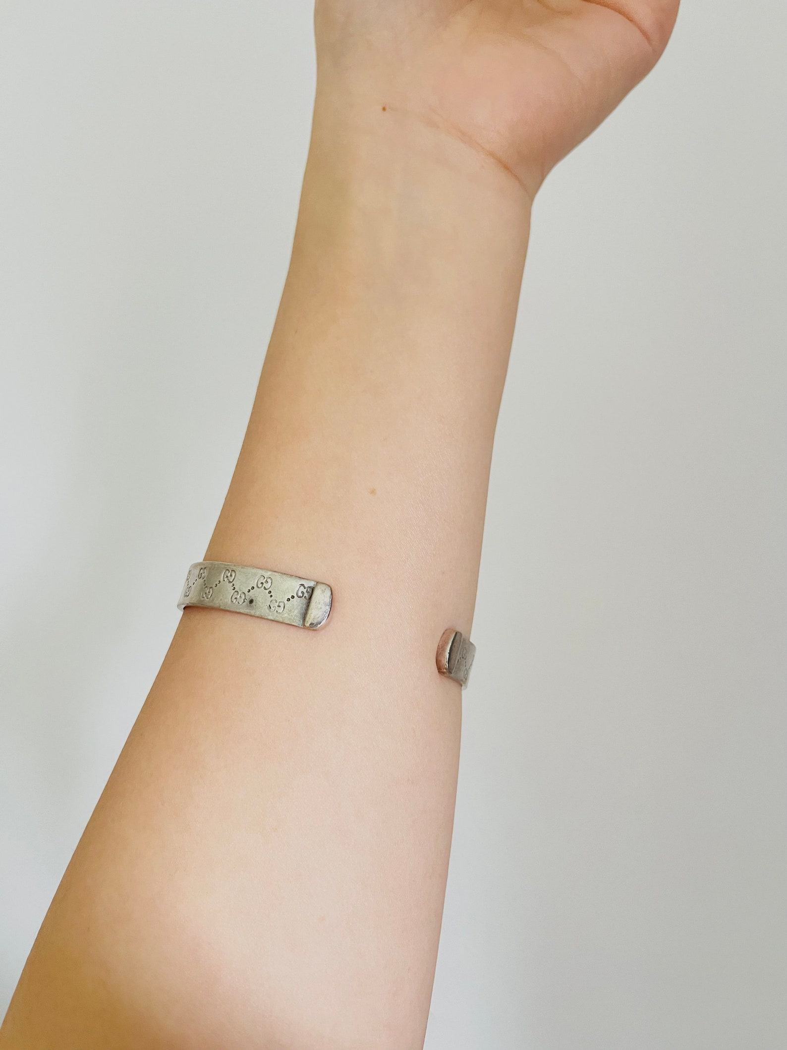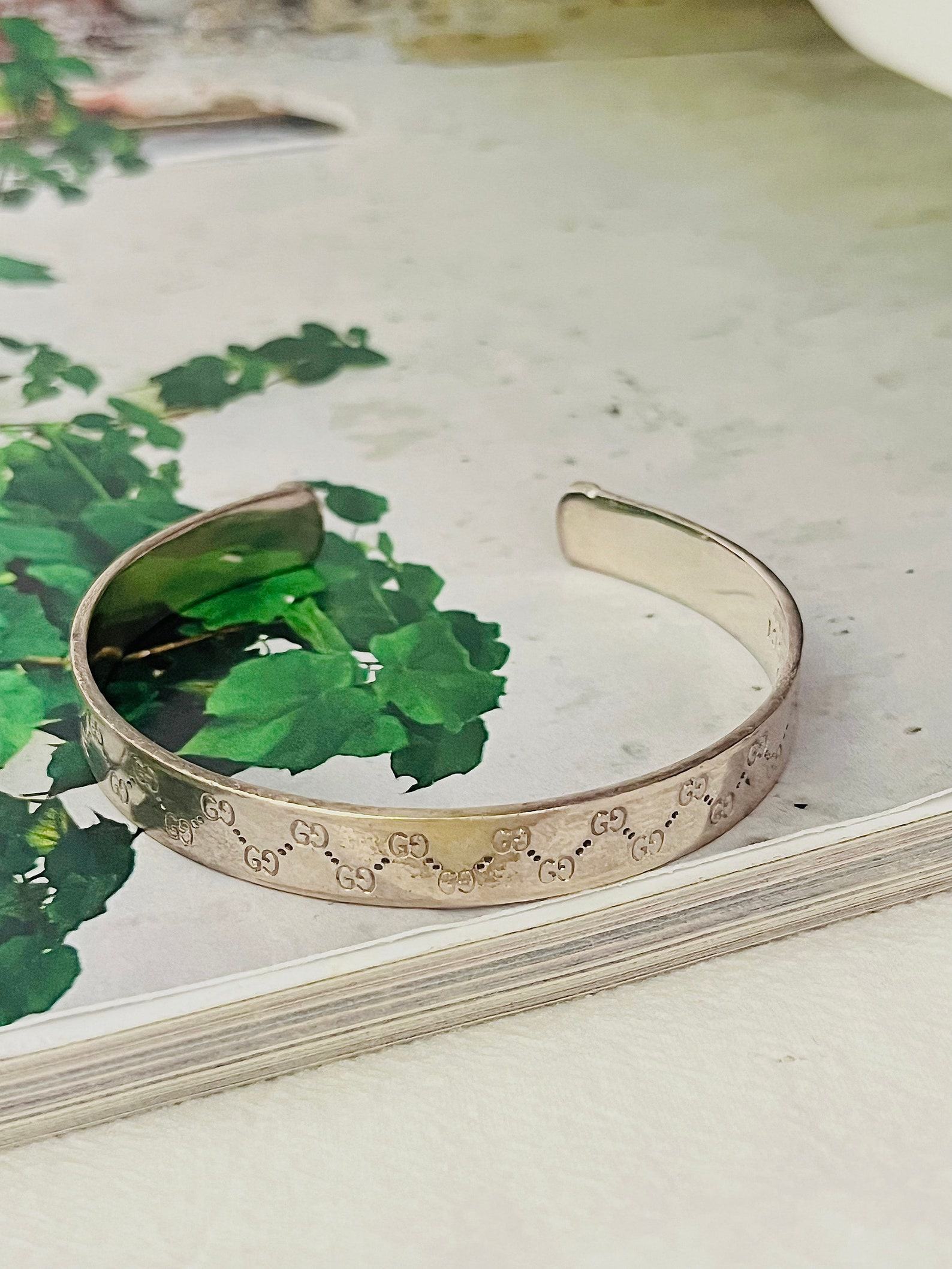 - Iconic Gucci Double G logo engraved on a chunky cuff bangle bracelet.