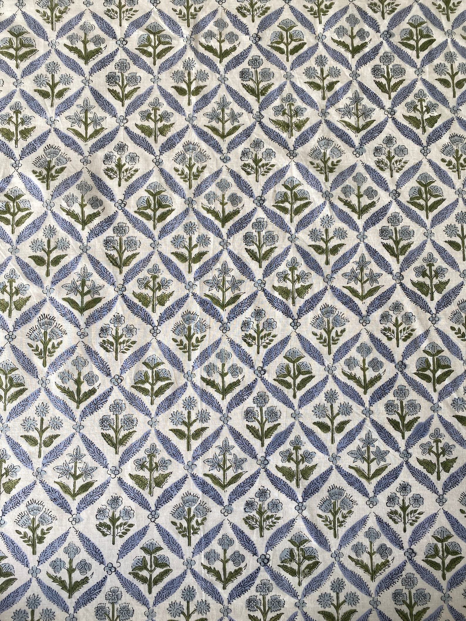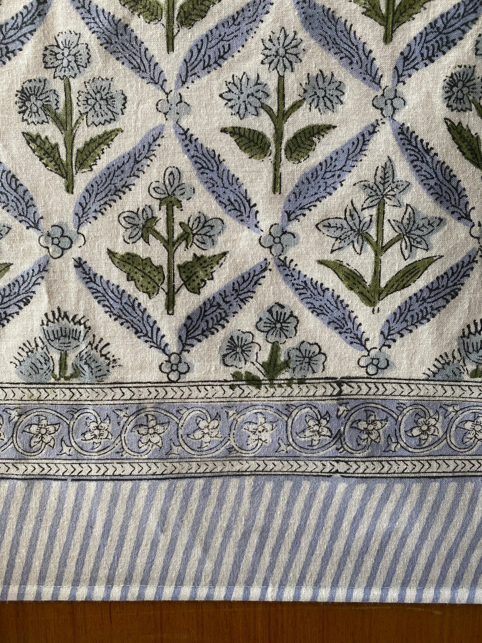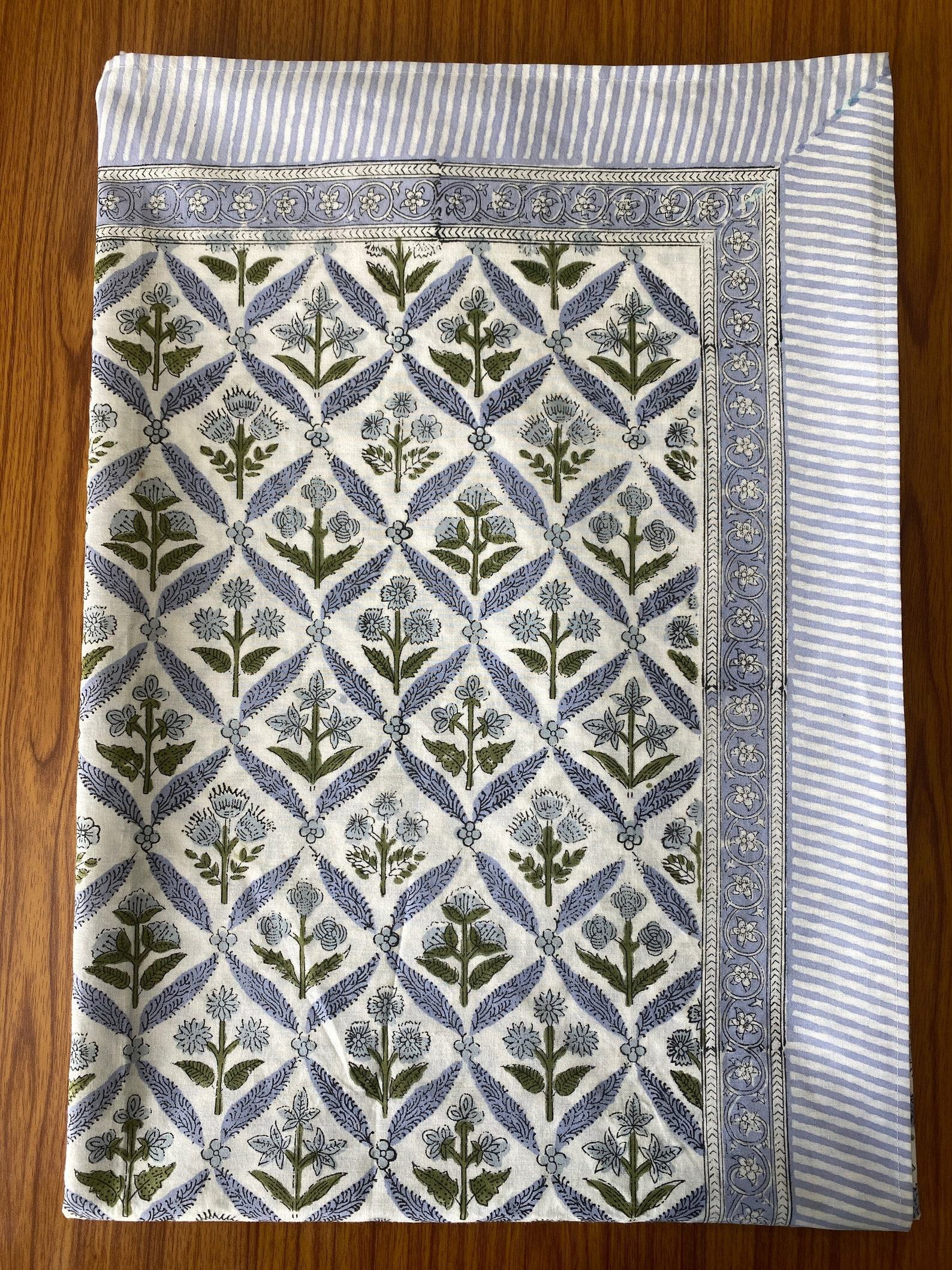 Handcrafted Elegance Light Steel Blue and Olive Green Block Printed Cotton Tablecloth for Memorable Gatherings