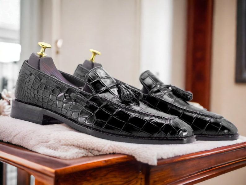 Exotic Alligator Texture: Elevate your style with these handcrafted loafers featuring a striking black alligator texture leather, offering a luxurious and sophisticated look. The unique pattern adds a touch of distinction to any outfit, making a bold statement.