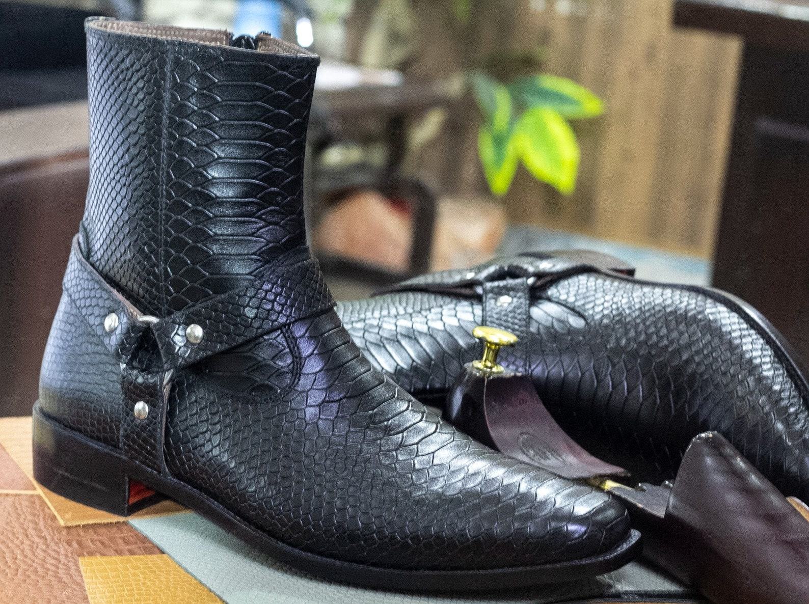 Handmade Black Leather Ankle Boots Men’s Python Accent Madrid Strap Zipper