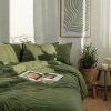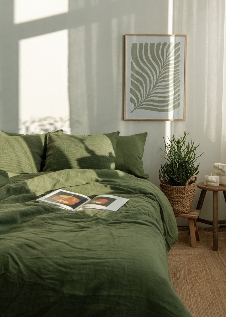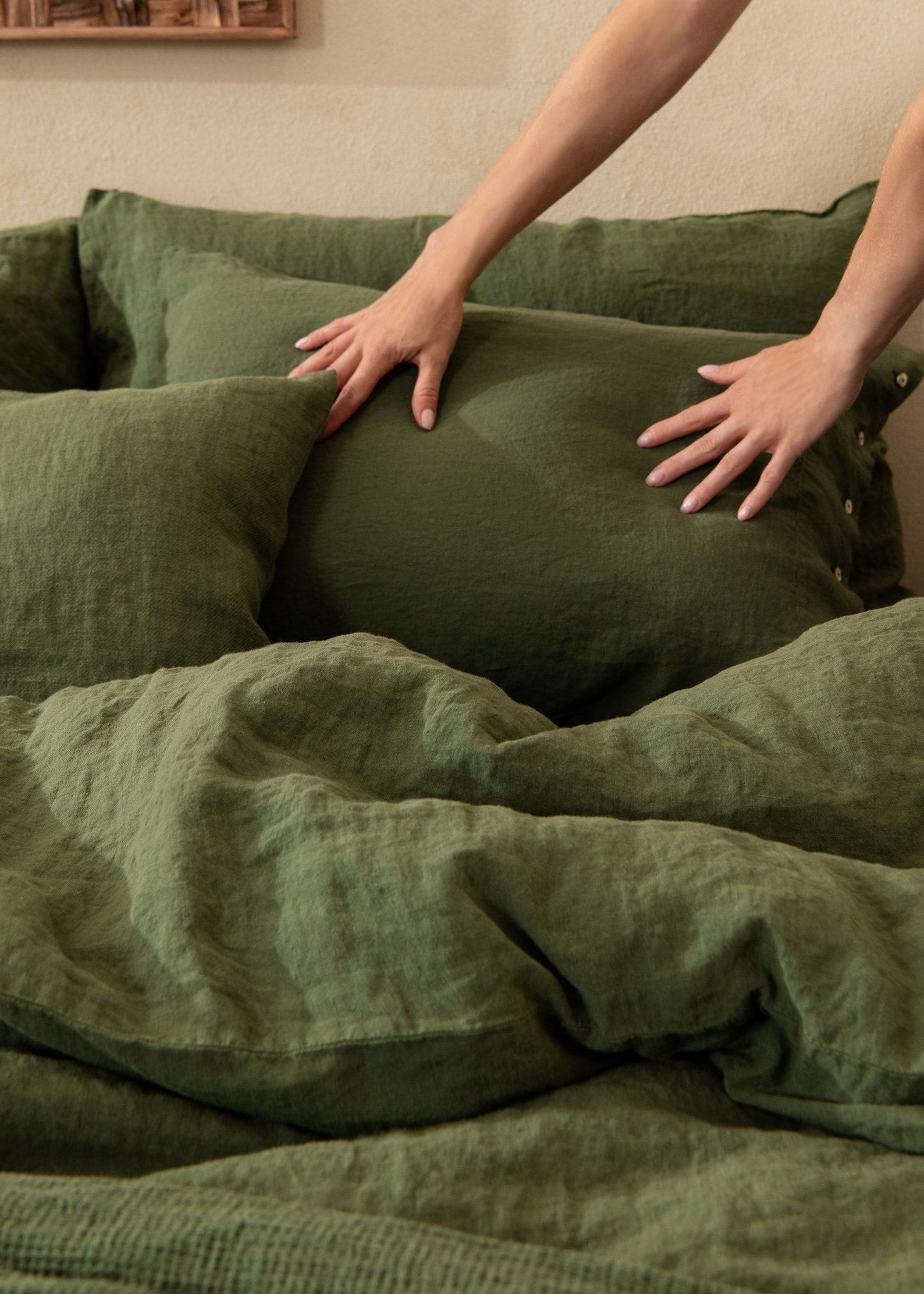 - Elevate your bedroom decor with our elegant green linen bedding set, adding a touch of sophistication and style to your space.