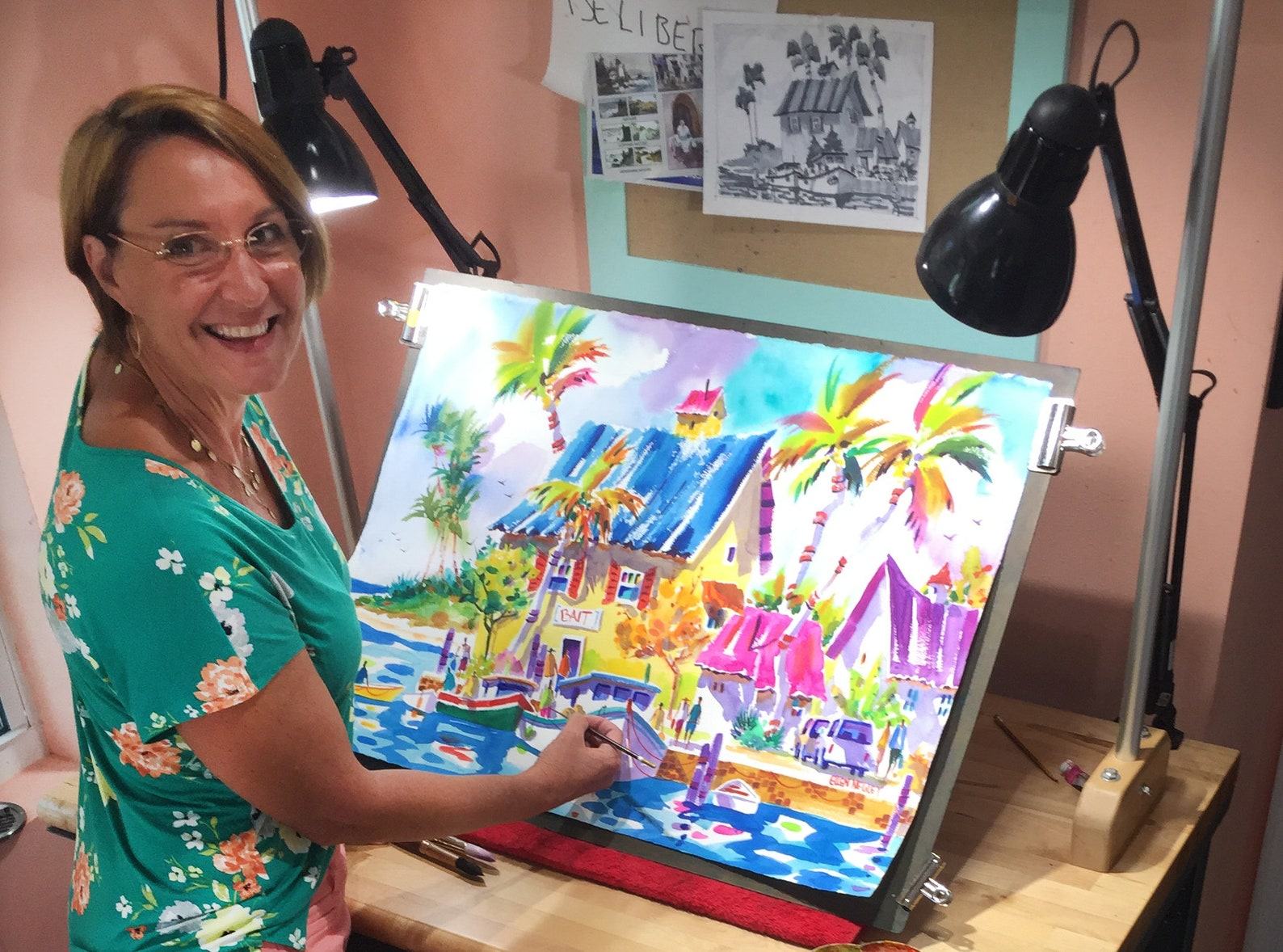 - Hand-painted by renowned artist Ellen Negley, this watercolor masterpiece showcases the island’s unique charm and tropical beauty.