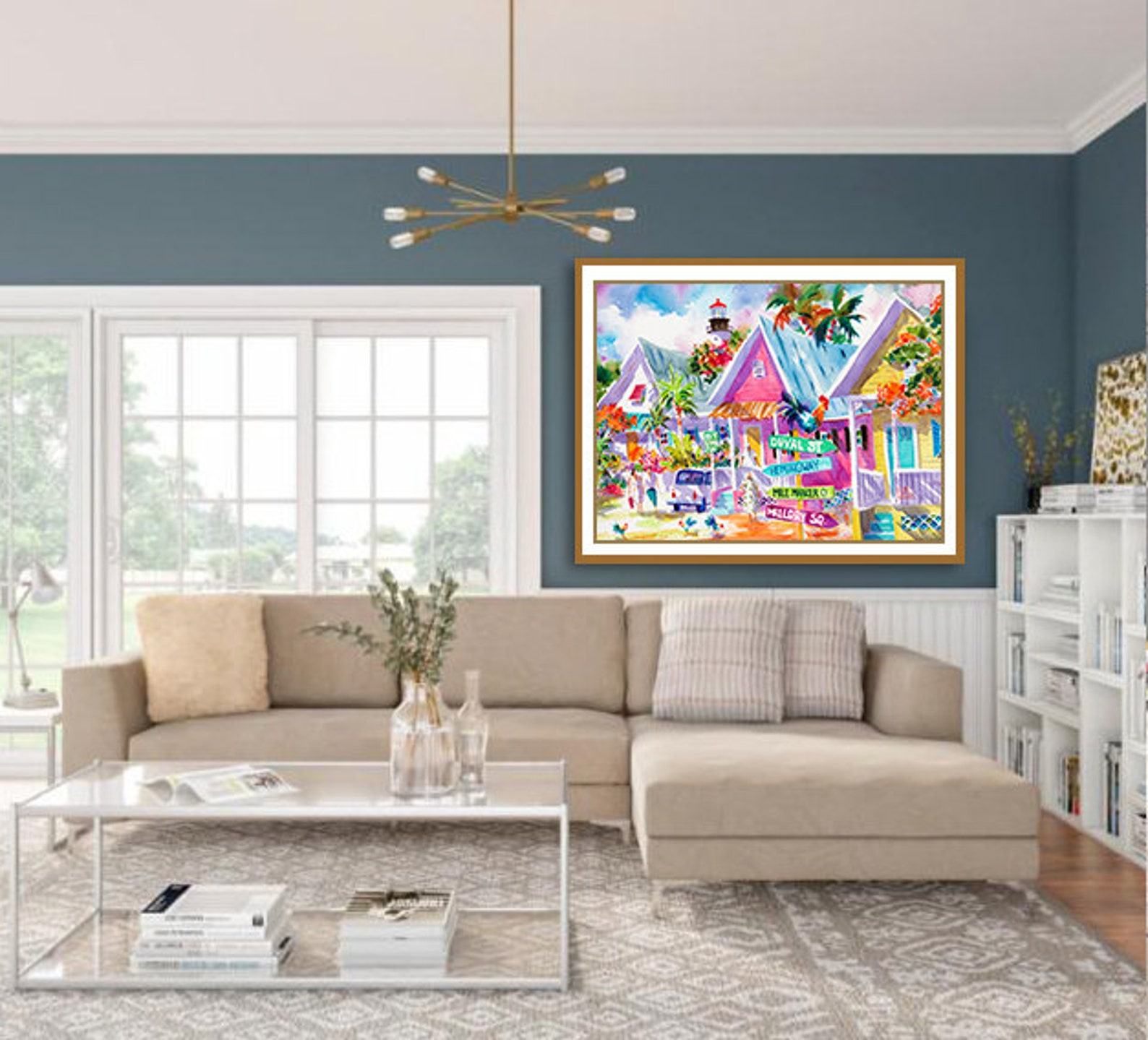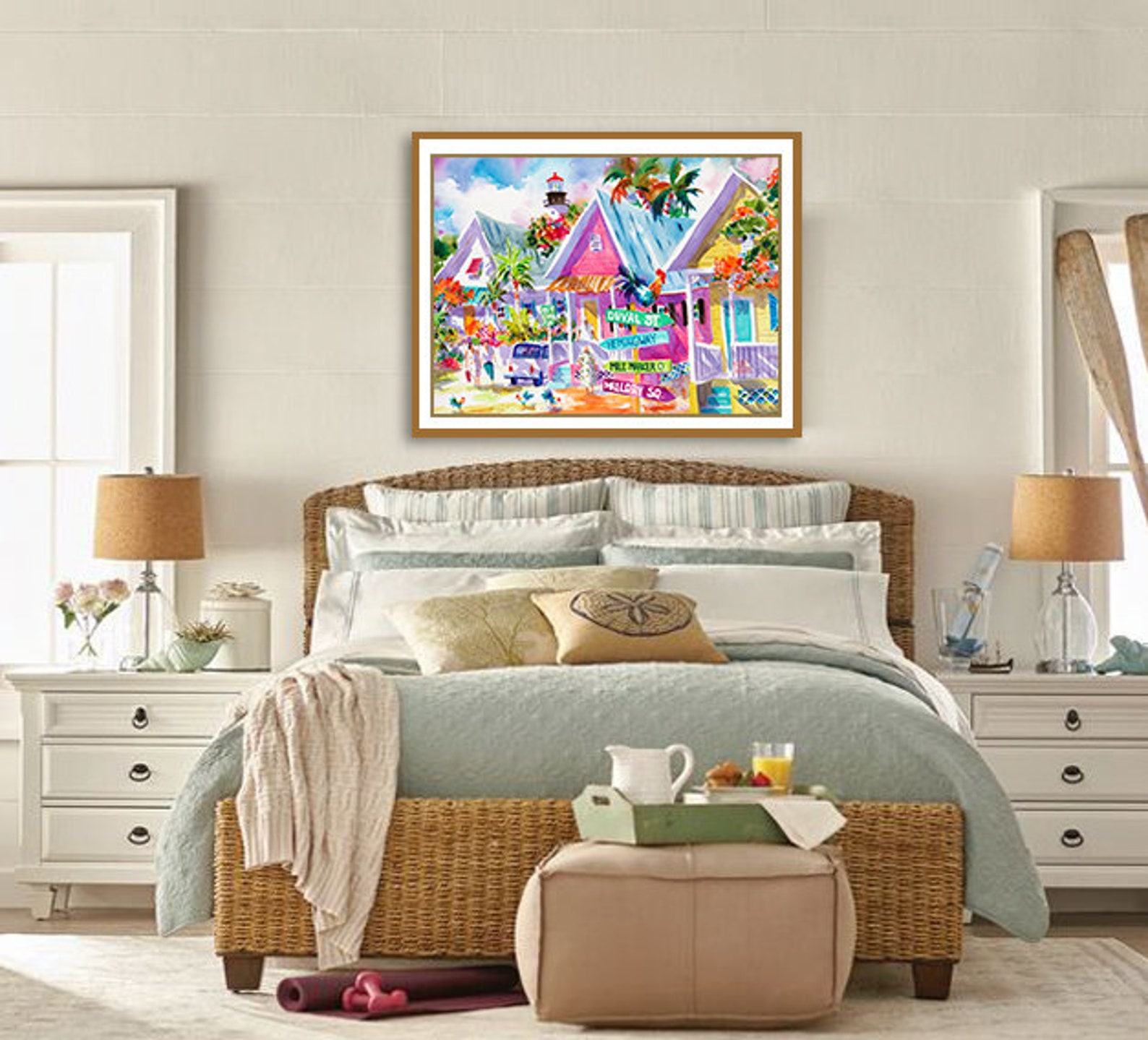 - The rooster art print adds a touch of whimsy and local flavor, capturing the essence of Key West’s laid-back lifestyle.