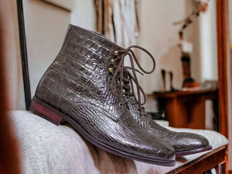 Exquisite Craftsmanship: Indulge in the unparalleled luxury of these men’s ankle boots, meticulously handcrafted from genuine black alligator leather. Each pair showcases the distinctive scale pattern and inherent texture of this premium material, help a unique and sophisticated aesthetic. The meticulous attention to detail in the handcrafting process for exceptional quality and enduring style.