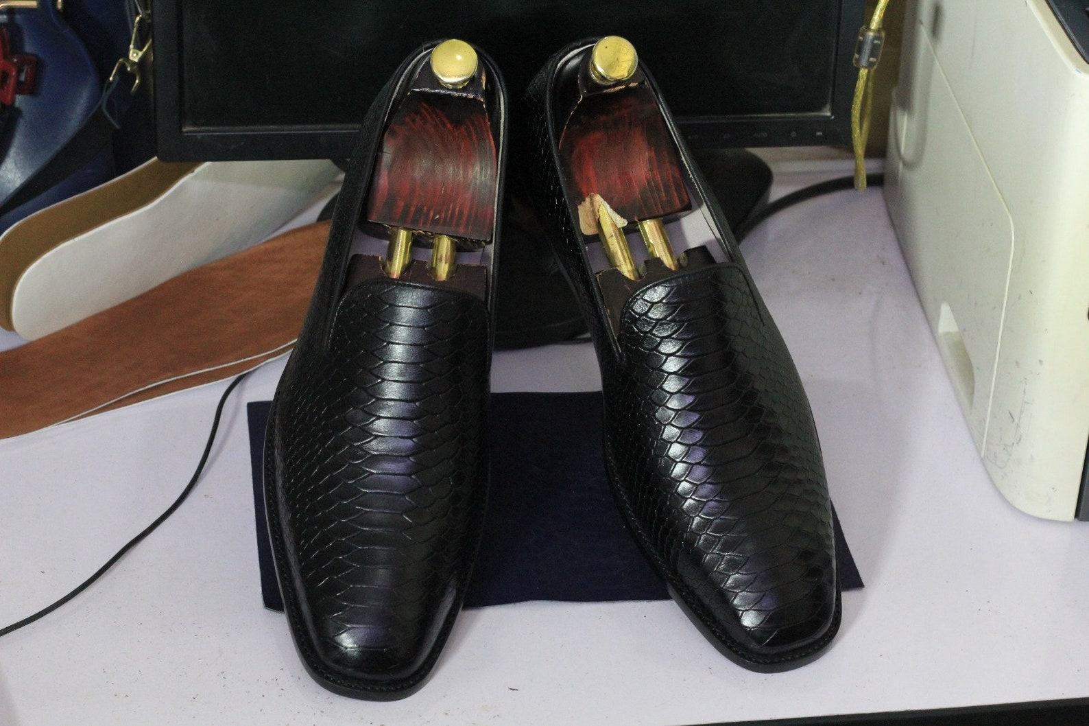 Luxury Black Python Texture Leather Loafers – Handmade Moccasin Dress Shoes for Men