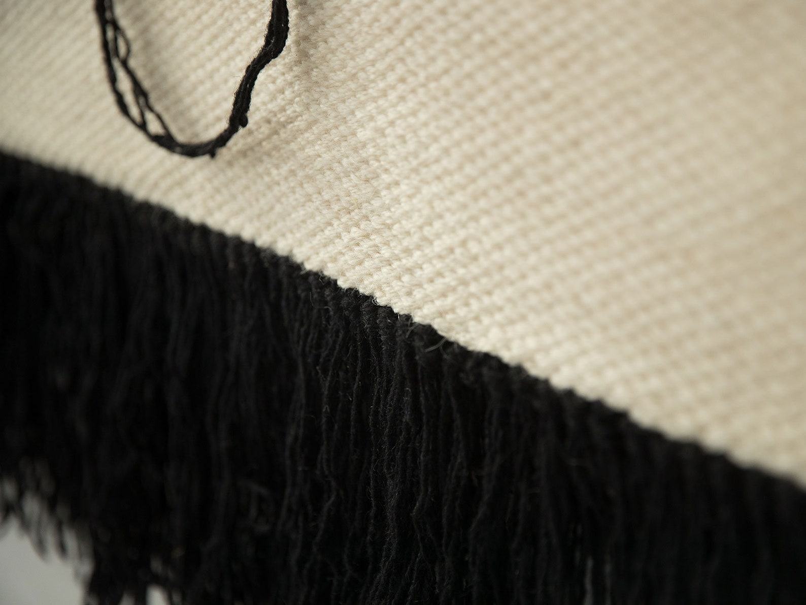 Bold Black Fringe Detail: The dramatic black fringe provides a contemporary edge, contrasting beautifully with the natural wool tones. This eye-catching detail enhances the tapestry’s overall aesthetic appeal.