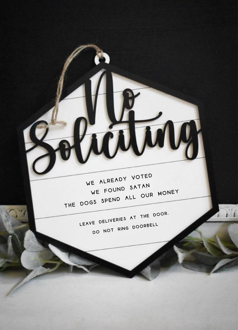- Keep unwanted visitors away with our humorous “No Soliciting” sign.