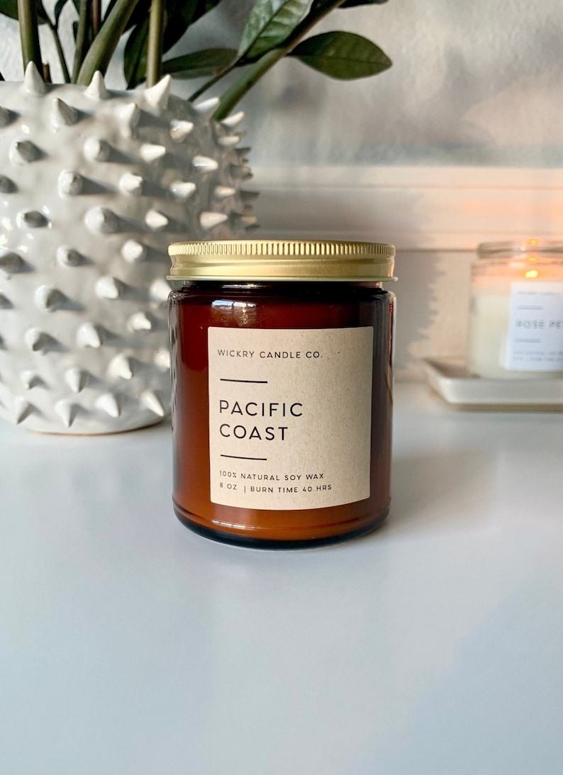 - Handcrafted soy candle with a captivating amber scent, evoking the warmth of California’s coastline.
