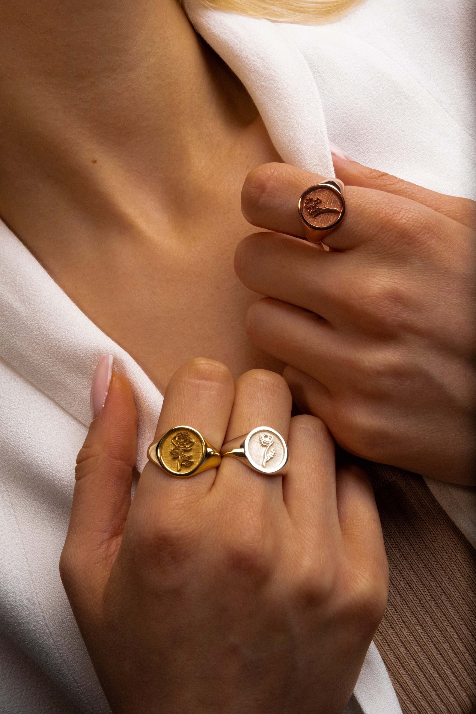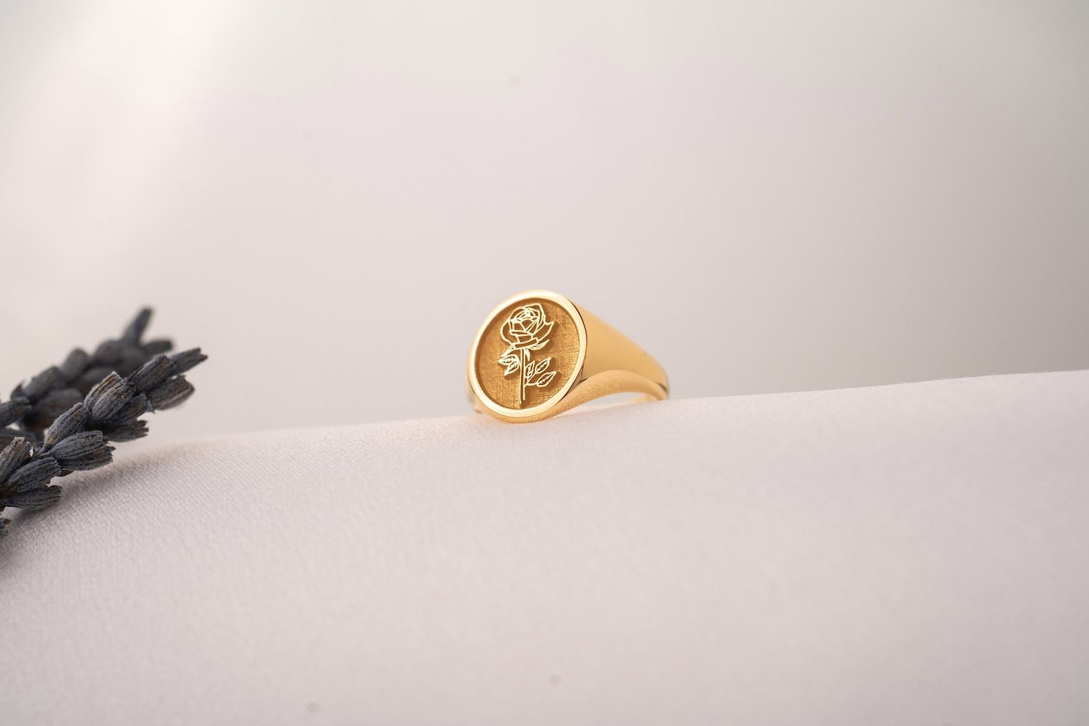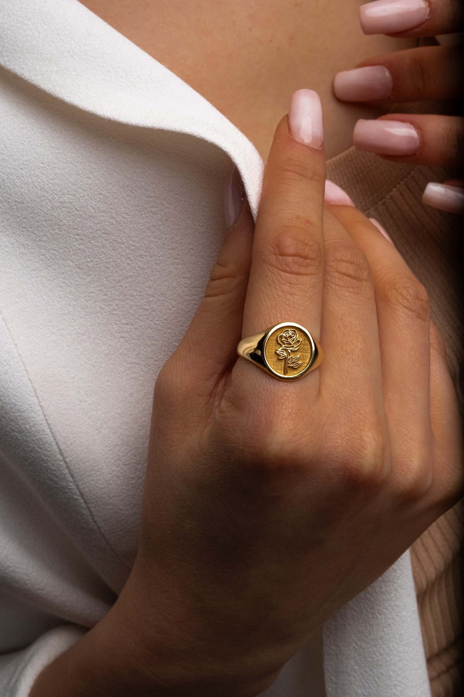 - Exquisitely crafted signet ring adorned with a delicate birth flower and a radiant sunflower, symbolizing growth and joy.