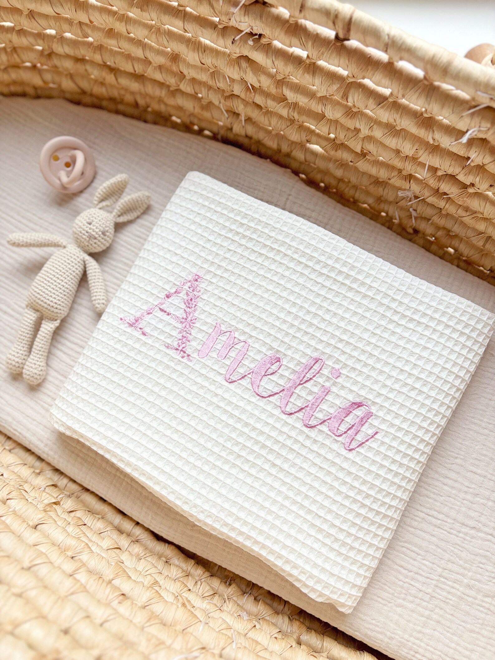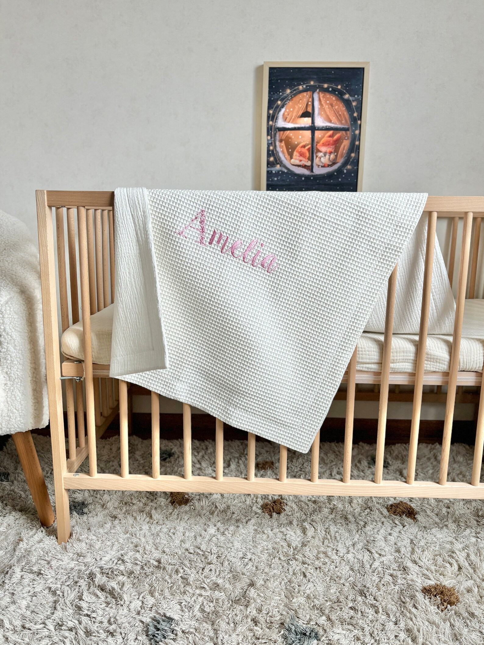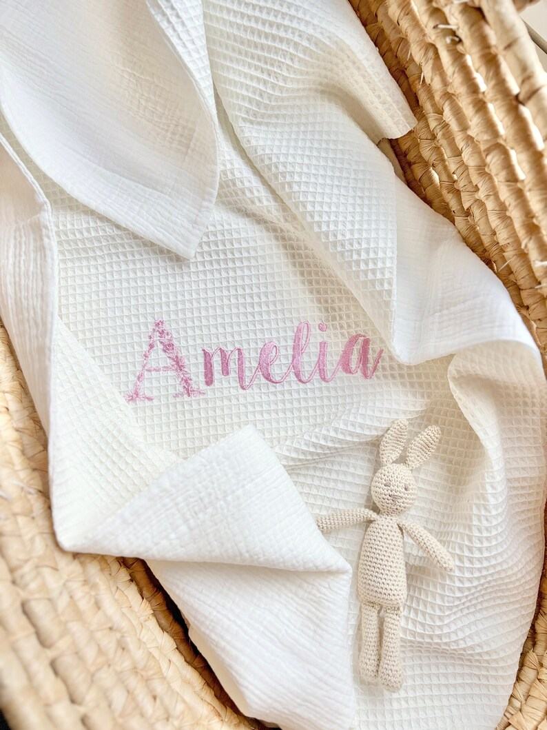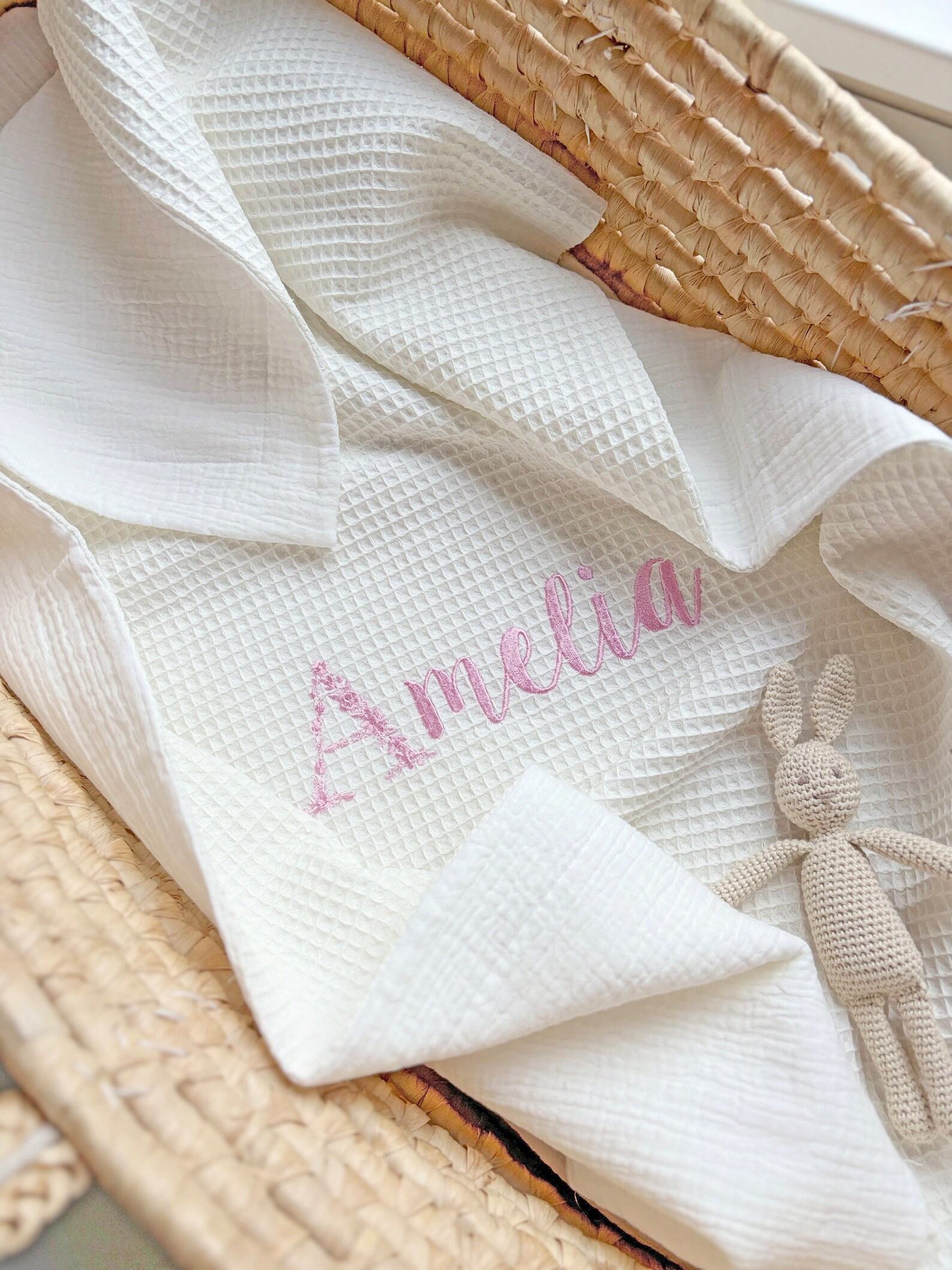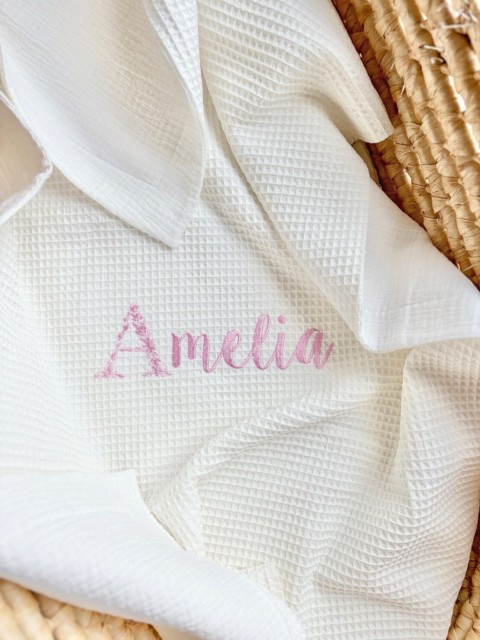Personalized Muslin Waffle Blanket Embroidered Name for Baby Girl, Perfect for Baby Showers and Newborns