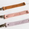 - Personalized pacifier clip with custom name engraved on genuine leather