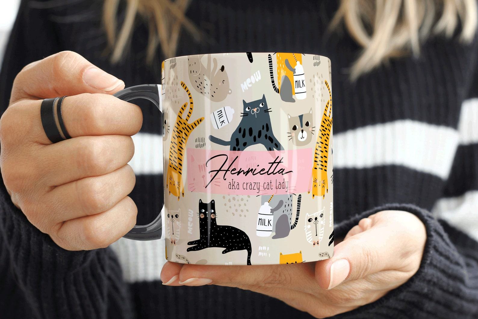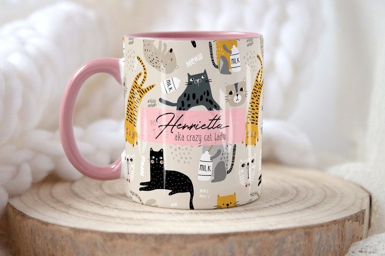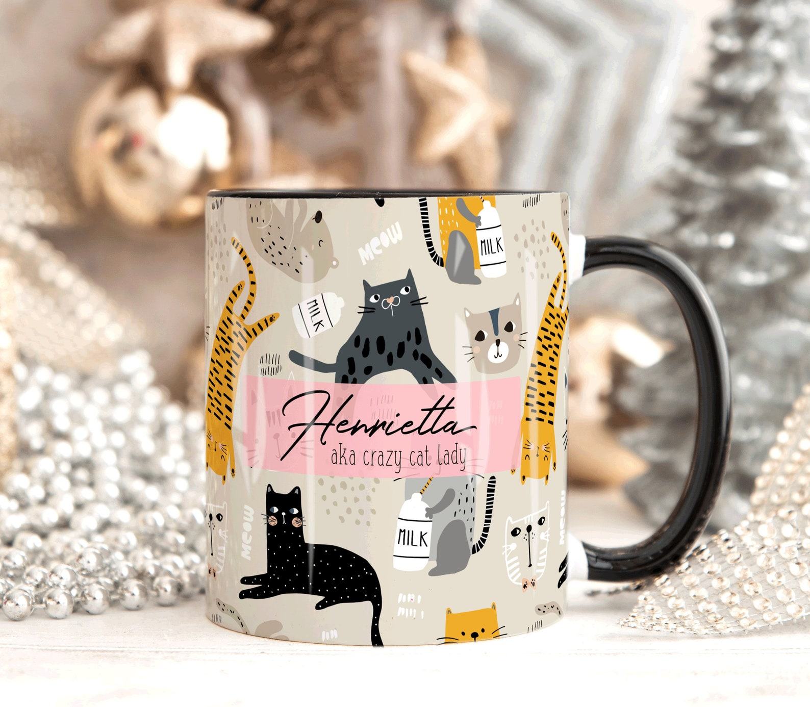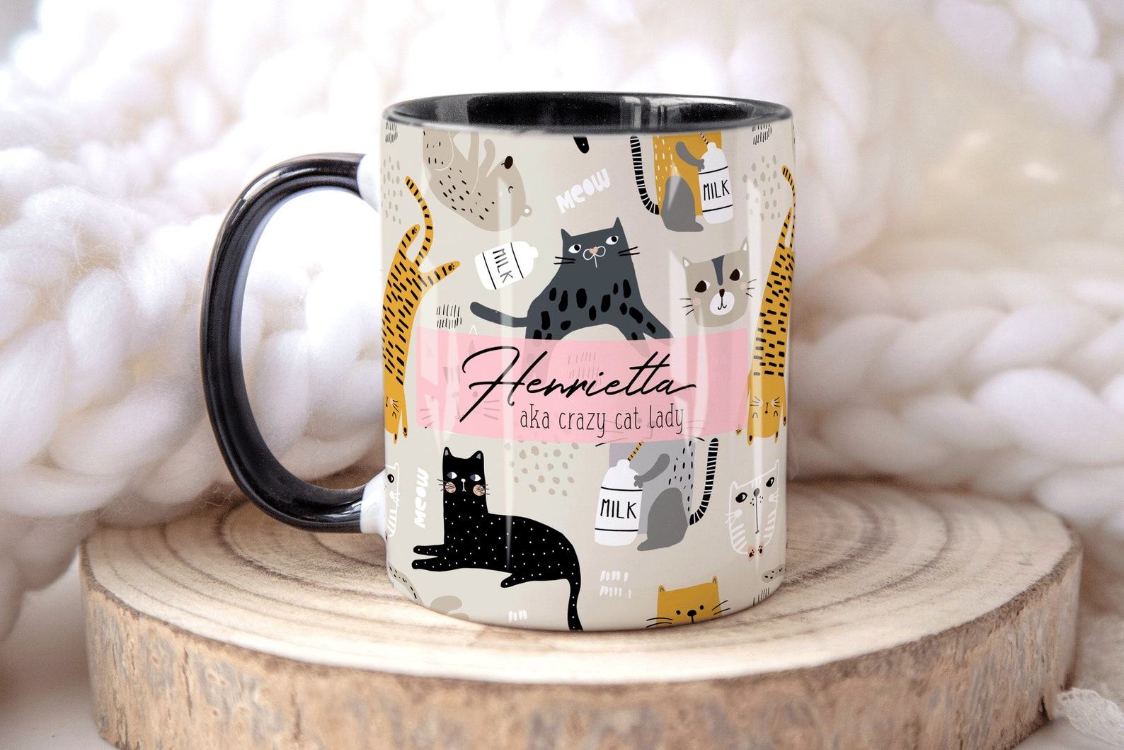 - Surprise your crazy cat lady with this personalized mug featuring her name and a playful cat design.