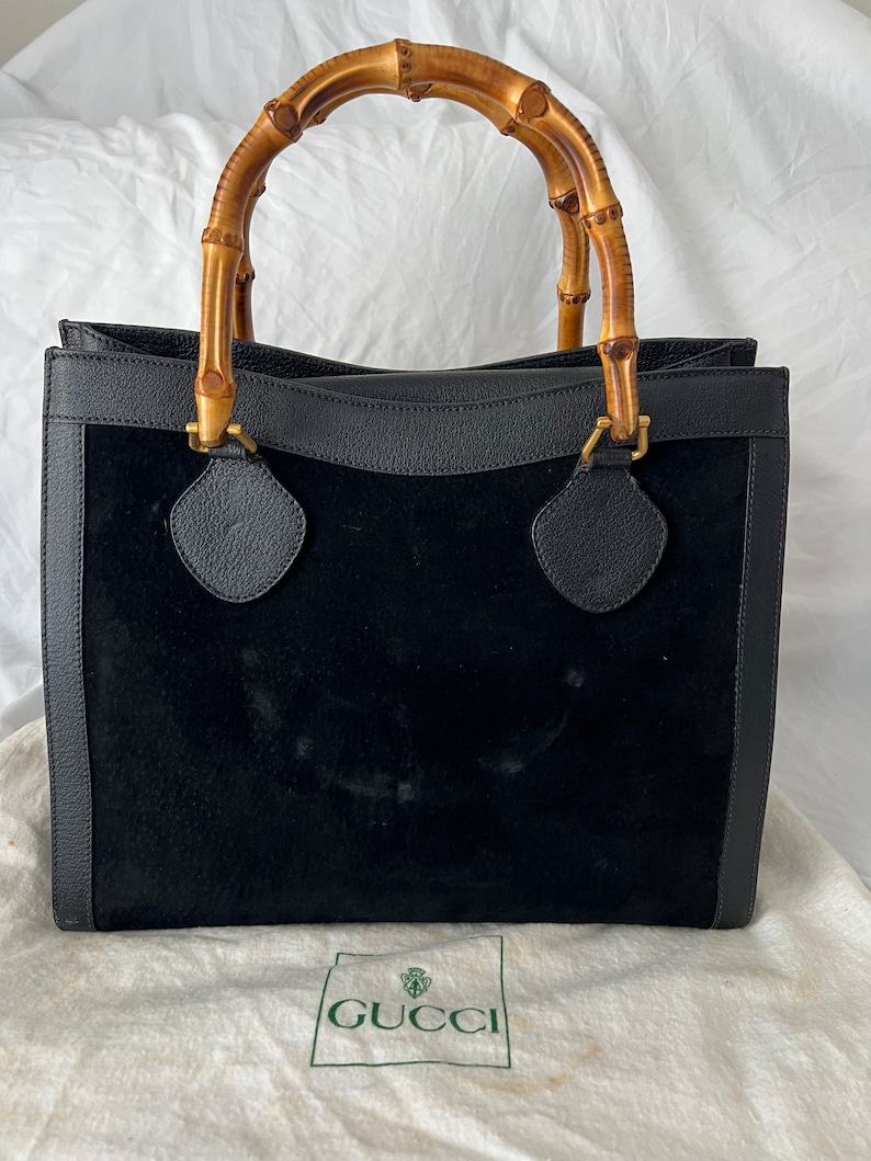 - Iconic Vintage Gucci Diana handbag, crafted from supple black suede and luxurious leather.