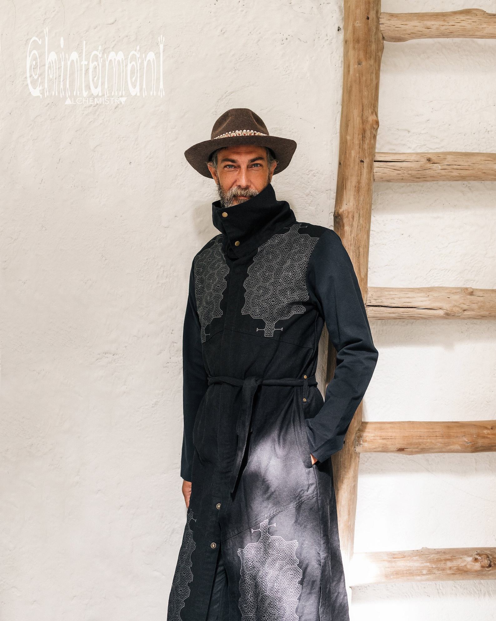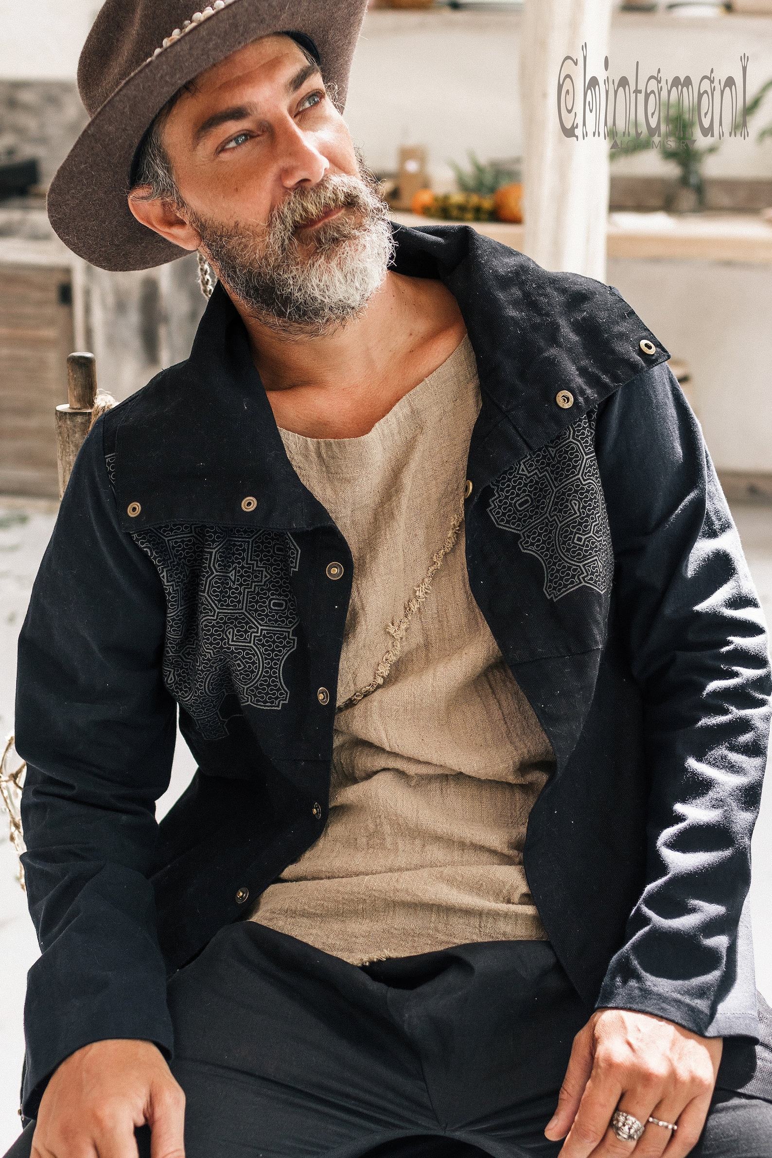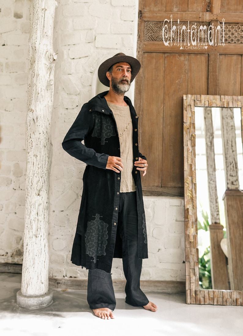 - Black cotton canvas men’s coat with tribal Shipibo patterns