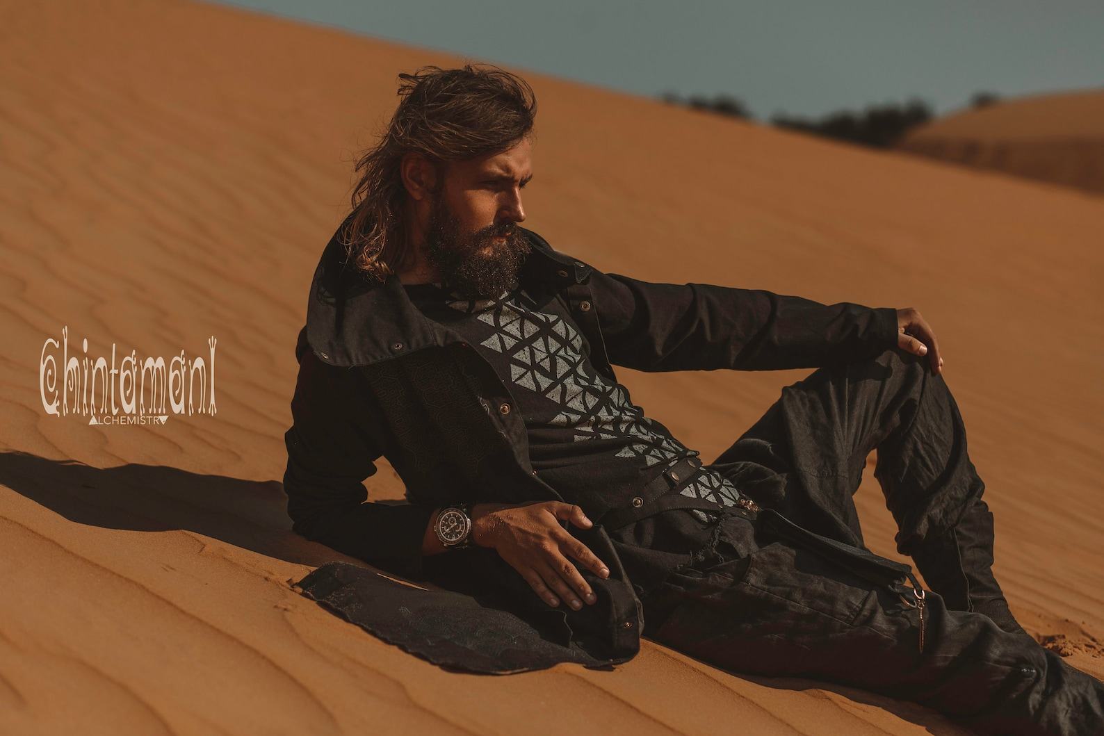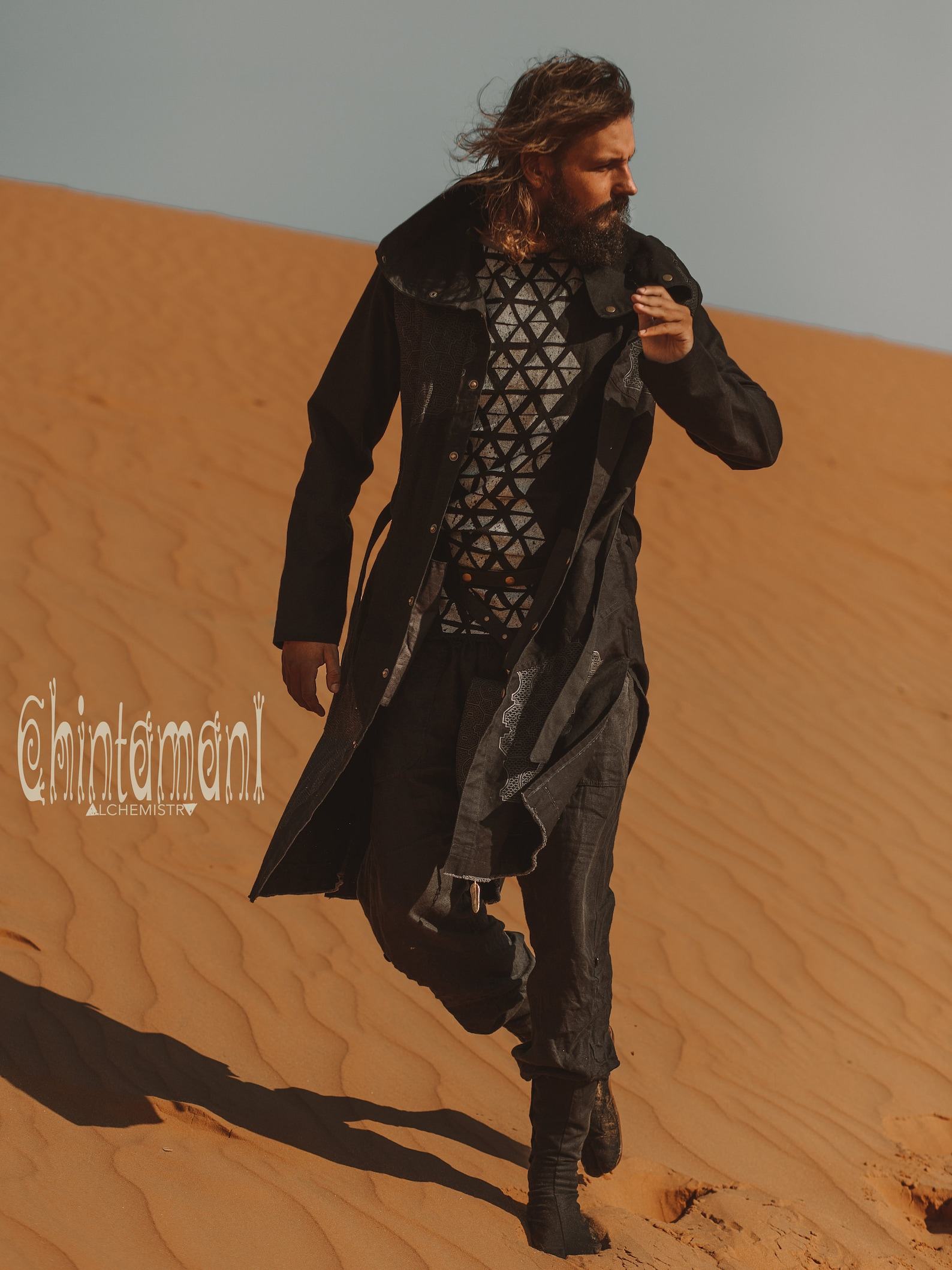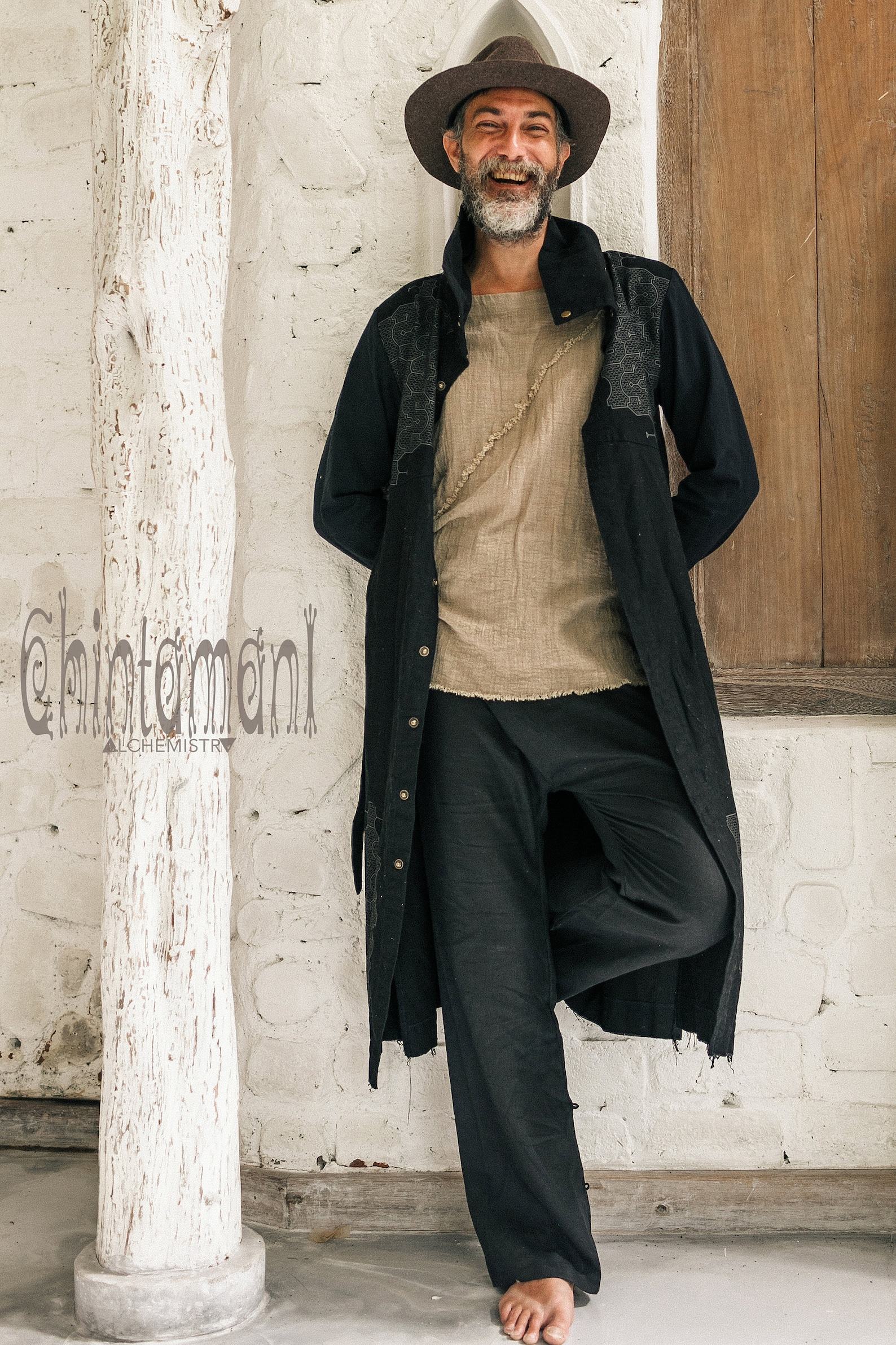 - Black cotton canvas men’s coat with tribal Shipibo patterns