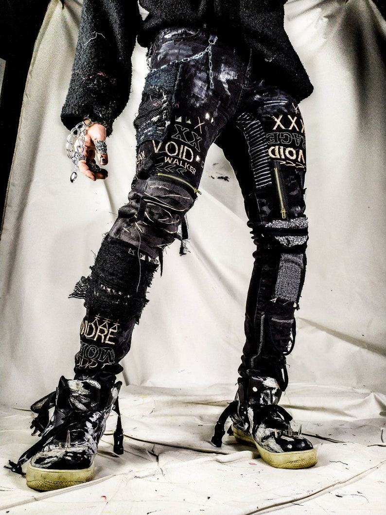 - Unleash your inner rebel with these custom handmade jeans, crafted with a unique blend of punk, goth, emo, metal, cyber, dark, ripped, crazy, weird, and funky elements.