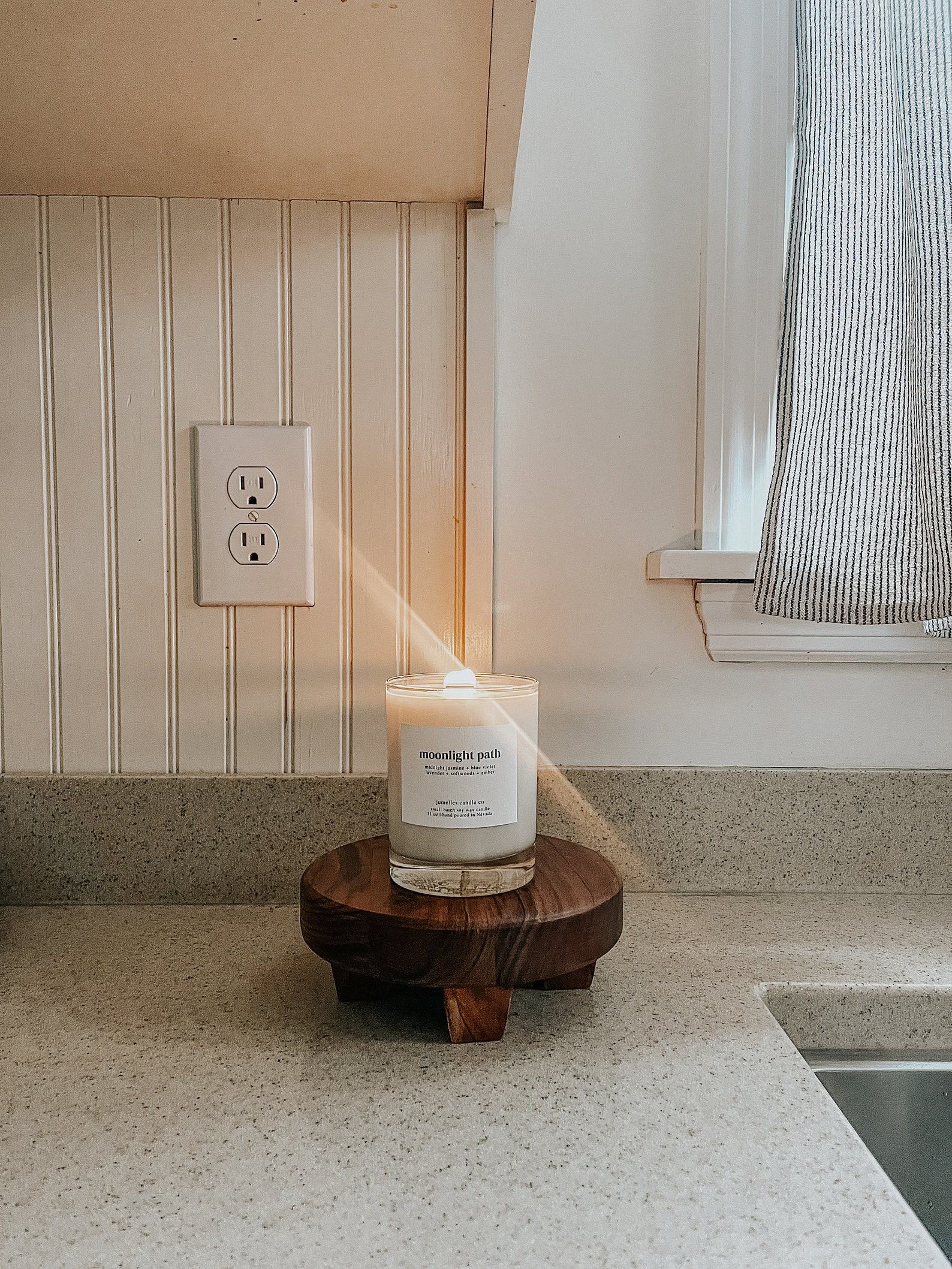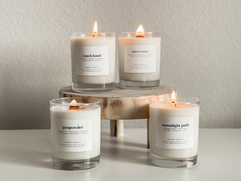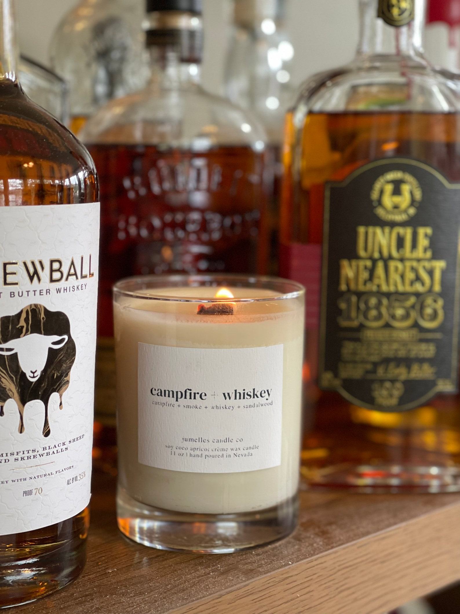 - Hand-poured soy wax candle in a repurposed whiskey glass